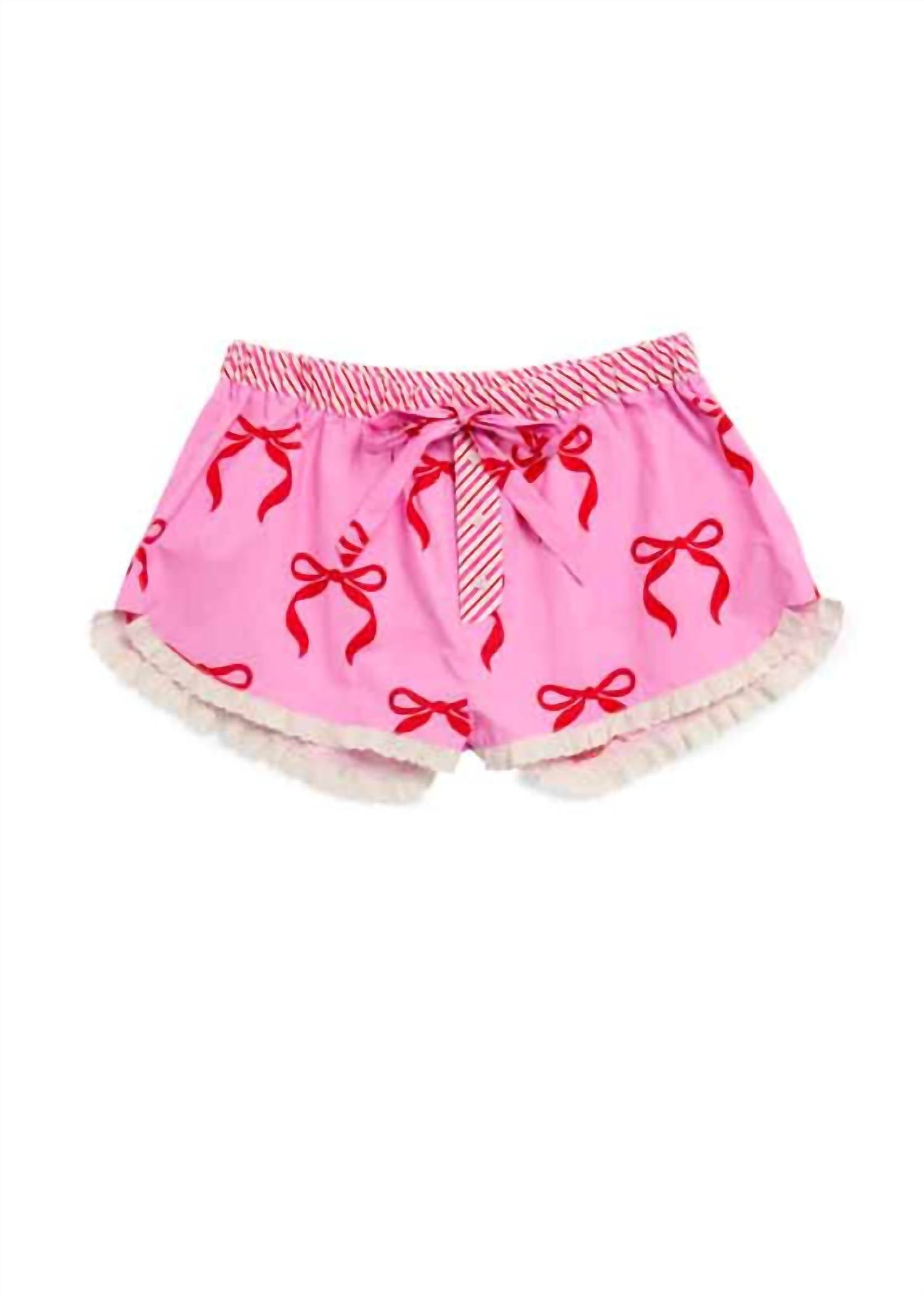 High-waist is here to stay and we especially love this style short. Introducing the Bow Boxer Shorts by Shiraleah, a delightful addition to your loungewear collection featuring a charming red bow print on soft pink cotton. These high-waisted shorts come with a comfortable elastic waistband, candy cane-striped drawstring, and intricate eyelet lace trim, perfect for cozy mornings and festive nights. Composition: 100% Cotton. Closure: Tie closure. Care: Machine washable and tumble dry for easy maintenance. With a 1.5" inseam, they offer a lightweight, breezy feel perfect for pairing with your favorite sweatshirts.