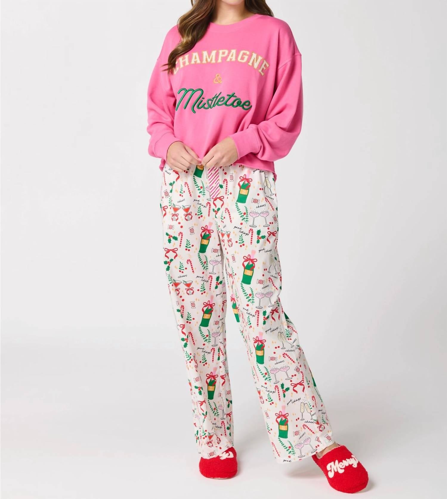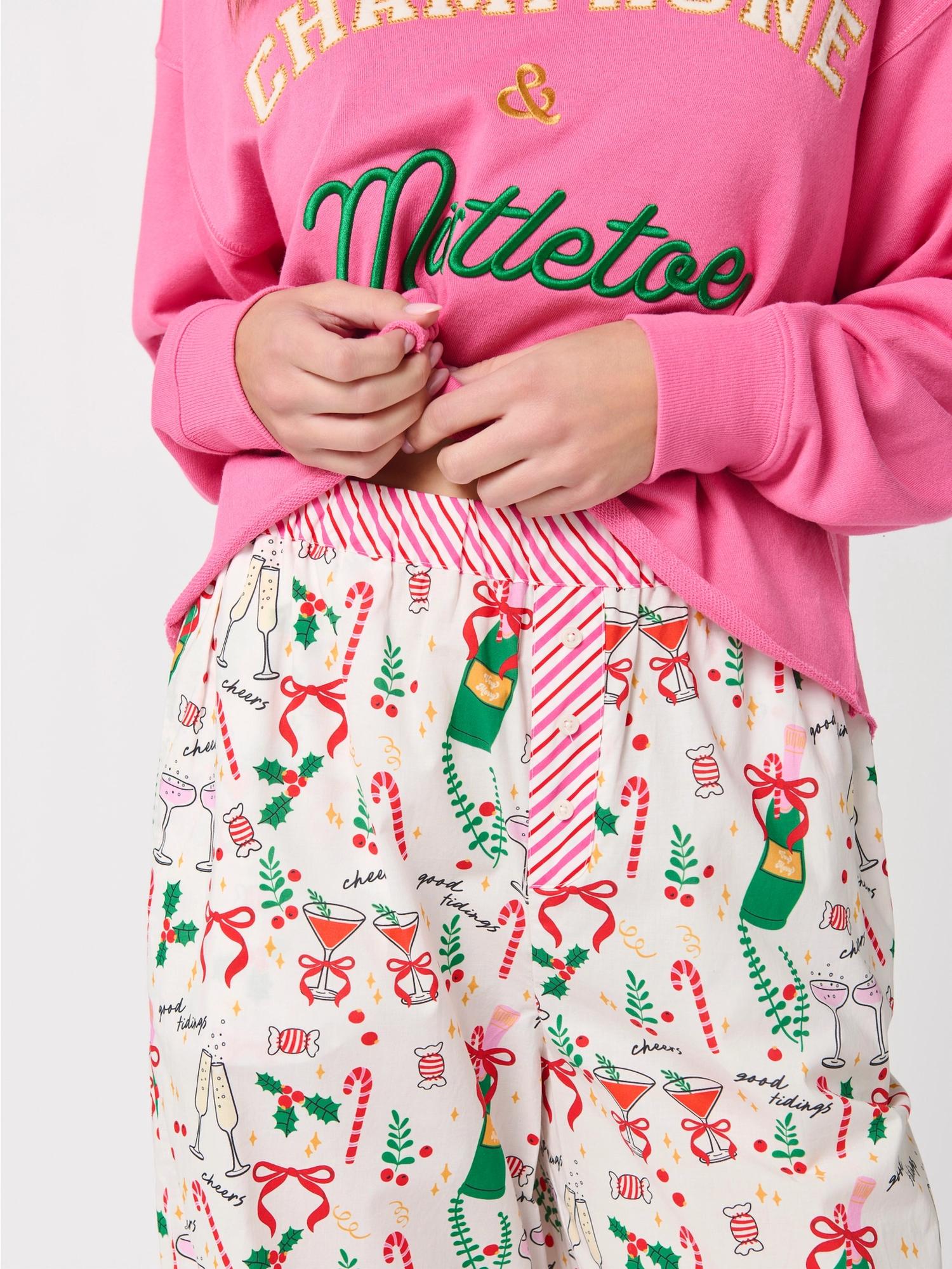 A straightleg pant that workes season after season. Dress these up with your favorite blouse or keep it casual with your go-to tee. Introducing the Celebration Boxer Pants by Shiraleah, a delightful addition to your holiday loungewear collection. Crafted from 100% cotton and designed with a high-rise waist, these full-length pants feature a playful print of champagne bottles, candy canes, and holly sprigs. The comfort fit includes a 29" inseam and an elastic waistband with a festive candy cane stripe drawstring for easy pull-on closure. Enjoy the convenience of on-seam pockets while you relax or celebrate, with care instructions recommending hand wash and laying flat to dry.