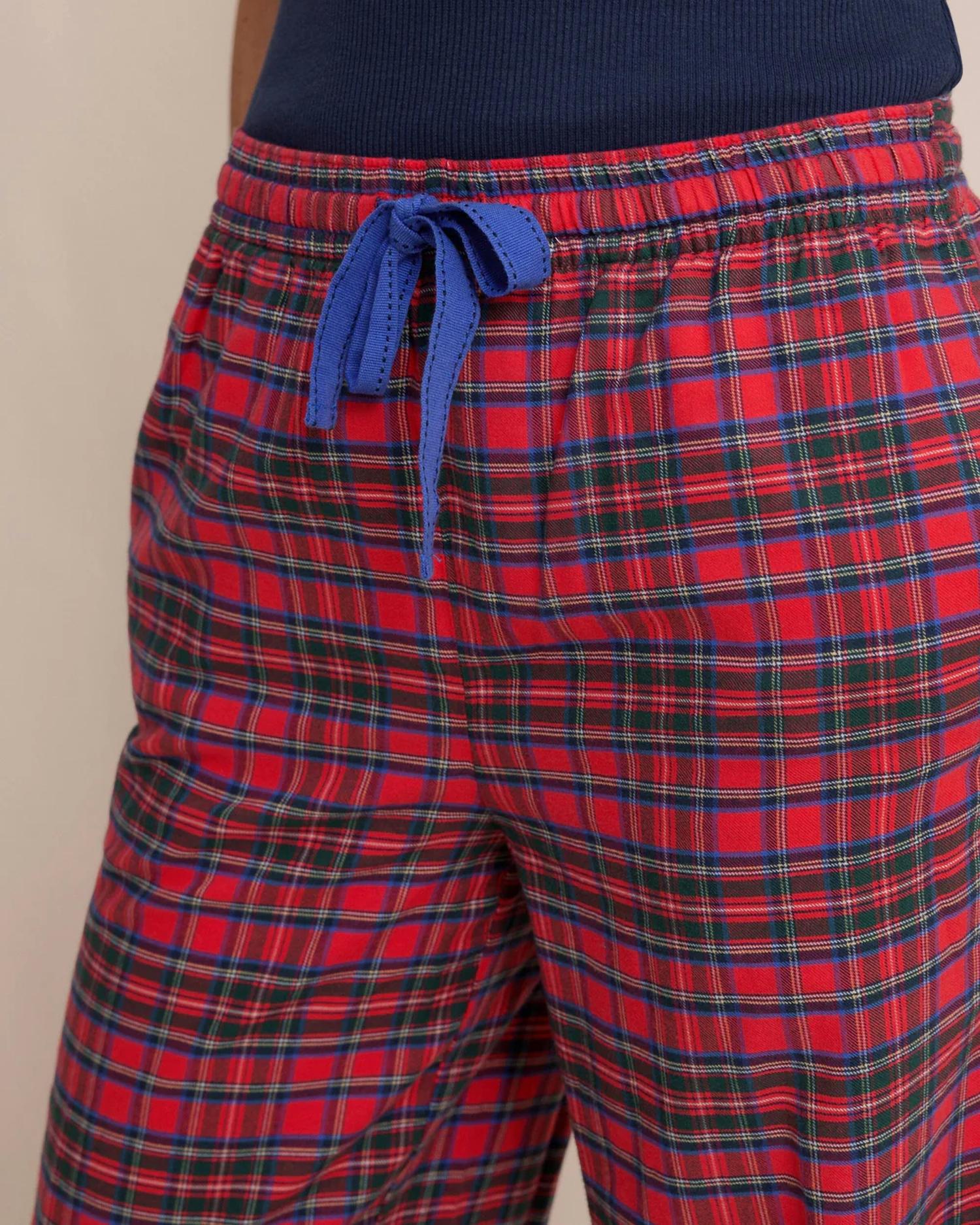 This straightleg pant is both stylish and comfortable. Did we mention the fit is perfection? Relax in style with the Women's South Carolina Tartan Lounge Pant by Southern Tide, featuring a timeless plaid pattern in Crab Red. Made from 100% soft cotton with poplin piping on the cuffs, these pants offer both comfort and an elevated look. Enjoy the comfort of a high-rise, elastic waistband with a tie closure, accommodating every preference with its adjustable drawcord. Care for your pants with hand wash and line dry instructions to maintain their cozy, festive charm. Model is 5'8.5" wearing an X-Small, with a 30" inseam for a perfect fit.