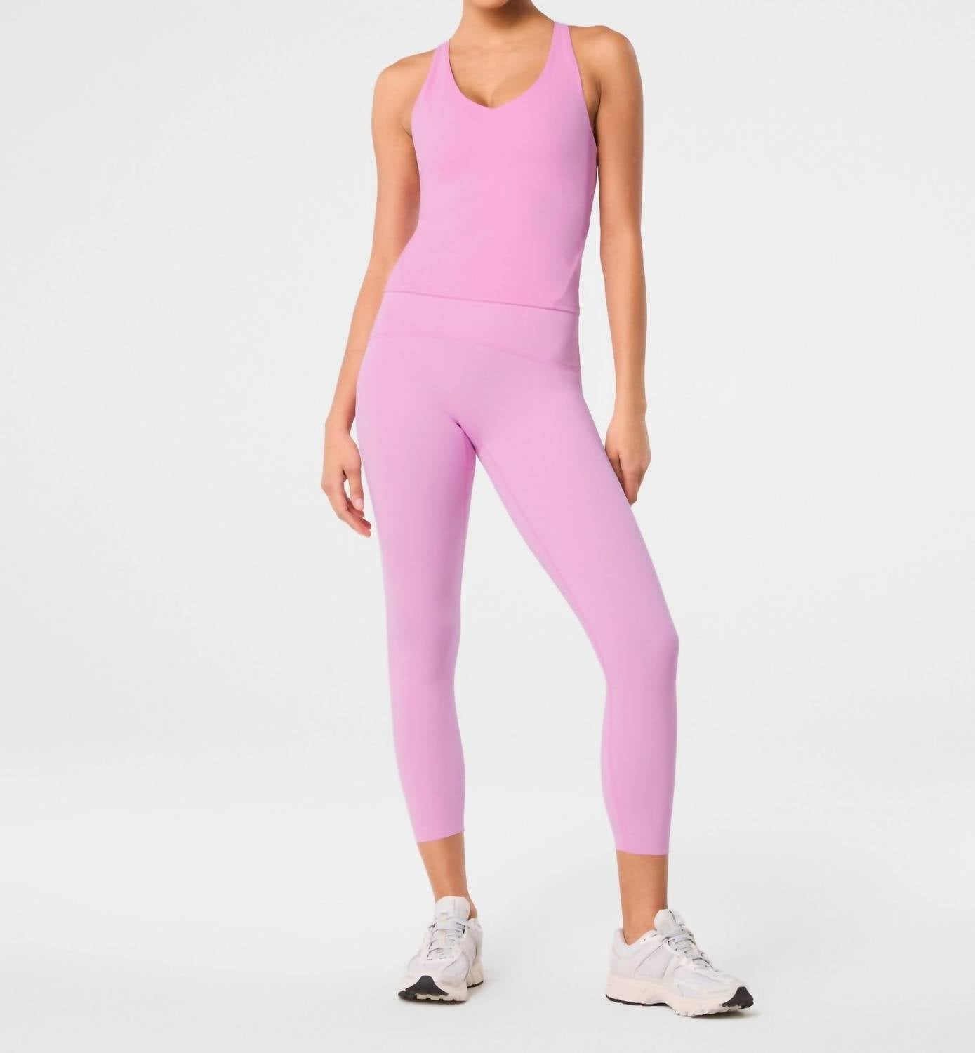 You'll be reaching for this best-selling legging all season long. Step up your workout wardrobe with the Booty Boost 7/8 Leggings by Spanx, designed in a flattering high-rise fit for women. Made from a durable 64% Nylon, 36% Elastane blend, these leggings come in a solid Petunia color with a tapered leg style and a 25-inch inseam, perfect for summer athleisure looks. The contoured waistband and targeted shaping ensure a snug, slim fit, while the pull-on closure and included pockets add functionality and convenience. Care is a breeze with machine wash and tumble dry instructions, making these leggings an ideal choice for your fitness and workout sessions.