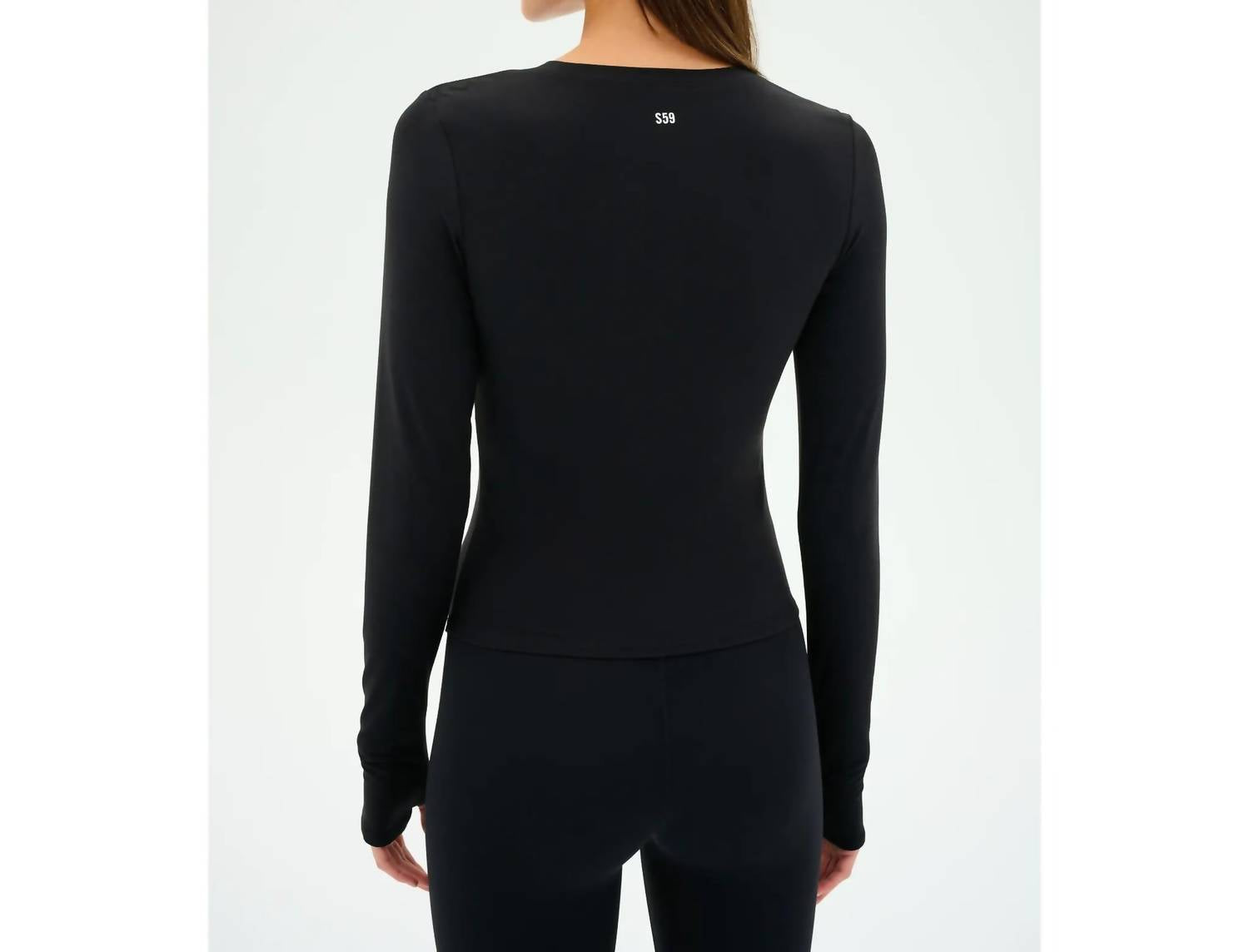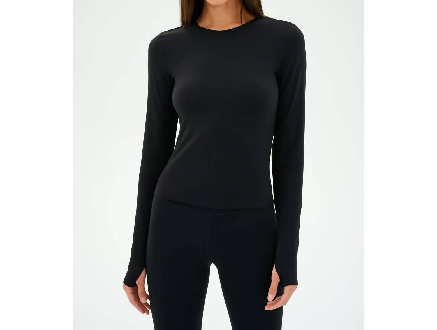A long sleeve top you can wear with denim, skirts, well... just about anything! Enhance your workout wardrobe with the Airweight Lite Long Sleeve Waist Length Top by SPLITS59, a stylish addition in classic black. Crafted from a lightweight nylon blend, this top offers a solid pattern and features a crewneck design perfect for active occasions. Its pull-on closure makes it a convenient choice for running, cycling, or gym sessions. Specially designed for athleisure, it provides quick-drying capabilities to keep you comfortable as you move.