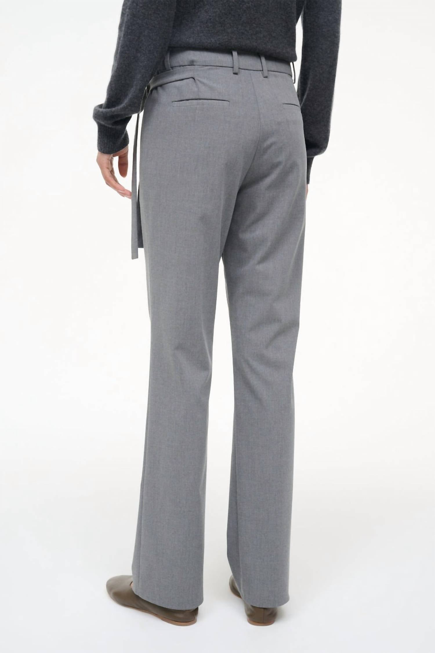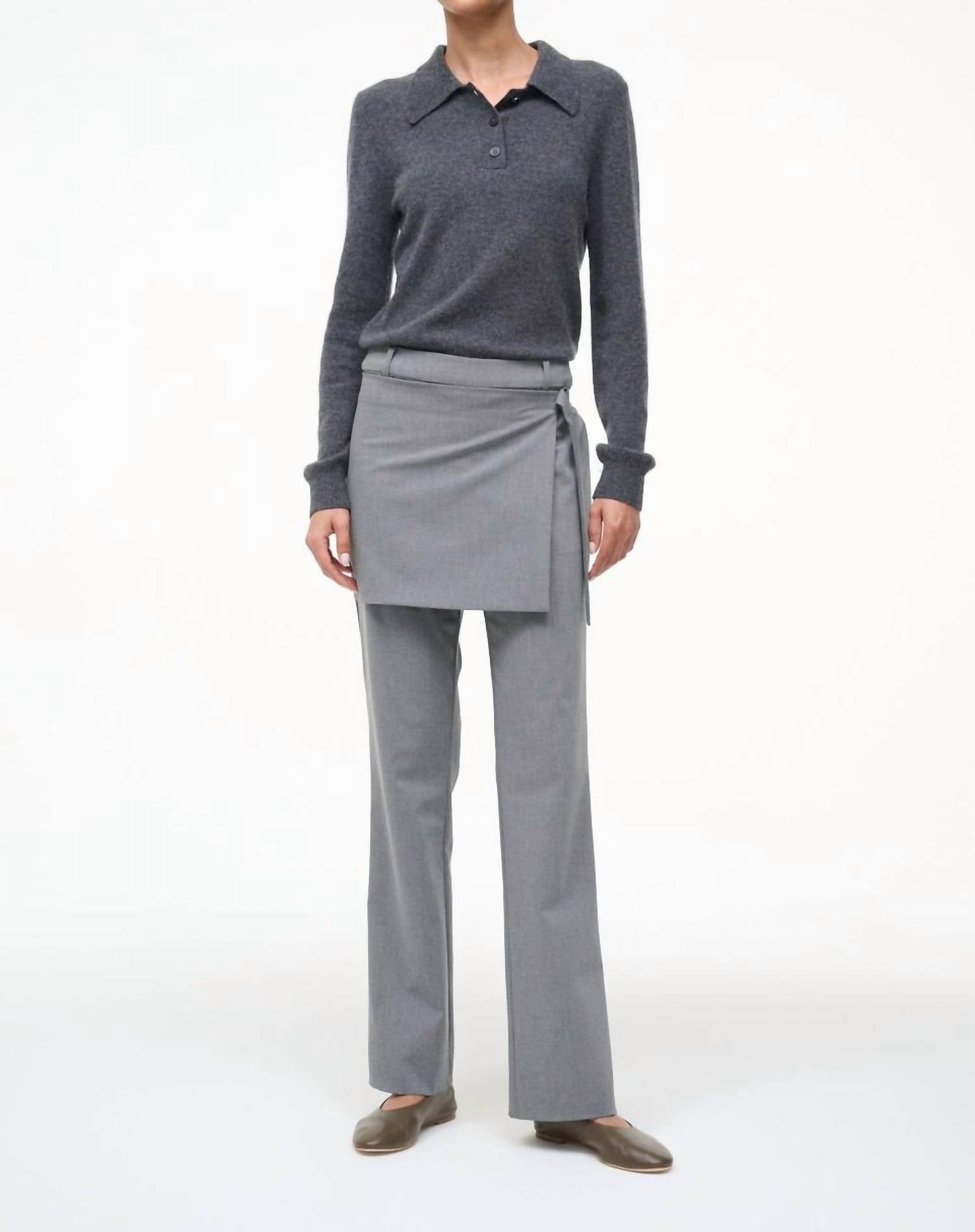 Introducing the Hannah Pant by STAUD, designed in a sophisticated Static color. This women's relaxed-fit, mid-rise bootcut trouser features a unique skirt overlay panel with an adjustable strap and is crafted from a viscose blend. Composition: Self - 62% Polyester, 26% Viscose, 6% Wool, 6% Spandex; Lining - 100% Polyester. Care: Dry clean only. Model is 5'10" and wearing a size 4.