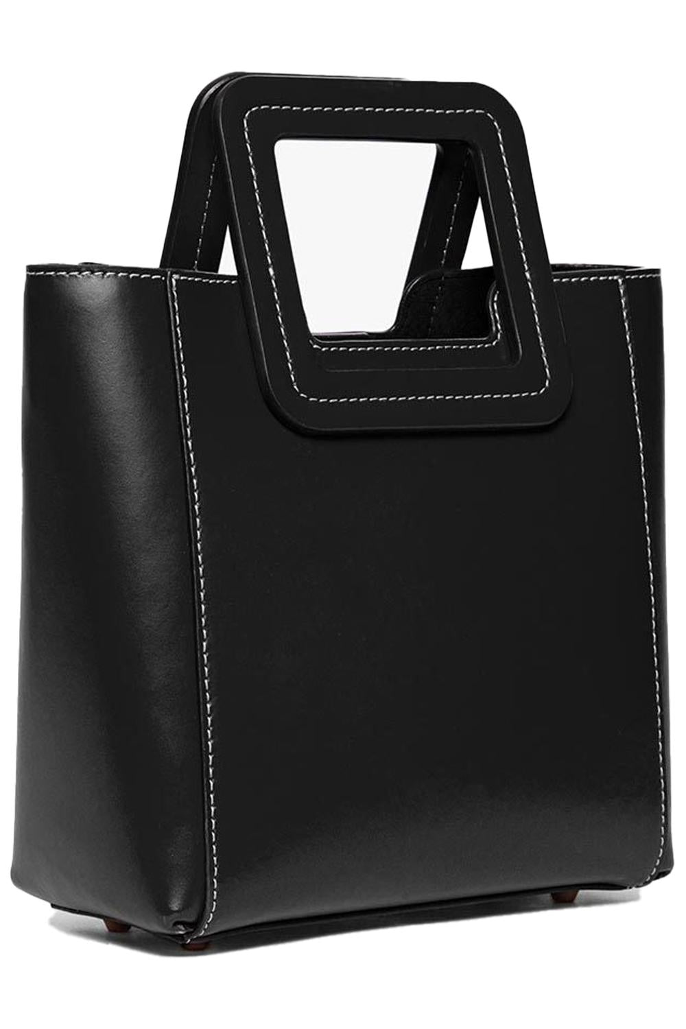 Small in size but a total statement maker. Introducing the Women's Mini Shirley Leather Bag by STAUD, an epitome of compact sophistication and modern design. Crafted from high-quality leather, this black mini bag features a solid construction with contrast top stitch detail, ensuring a luxurious finish and timeless appeal. Functionality meets style with an interior spacious enough to hold essentials, and a removable inner zip pouch for added security. With dimensions of 3" in depth and 8" in width, this bag is versatile for day-to-night transitions, complete with an adjustable shoulder strap for varied styling options.