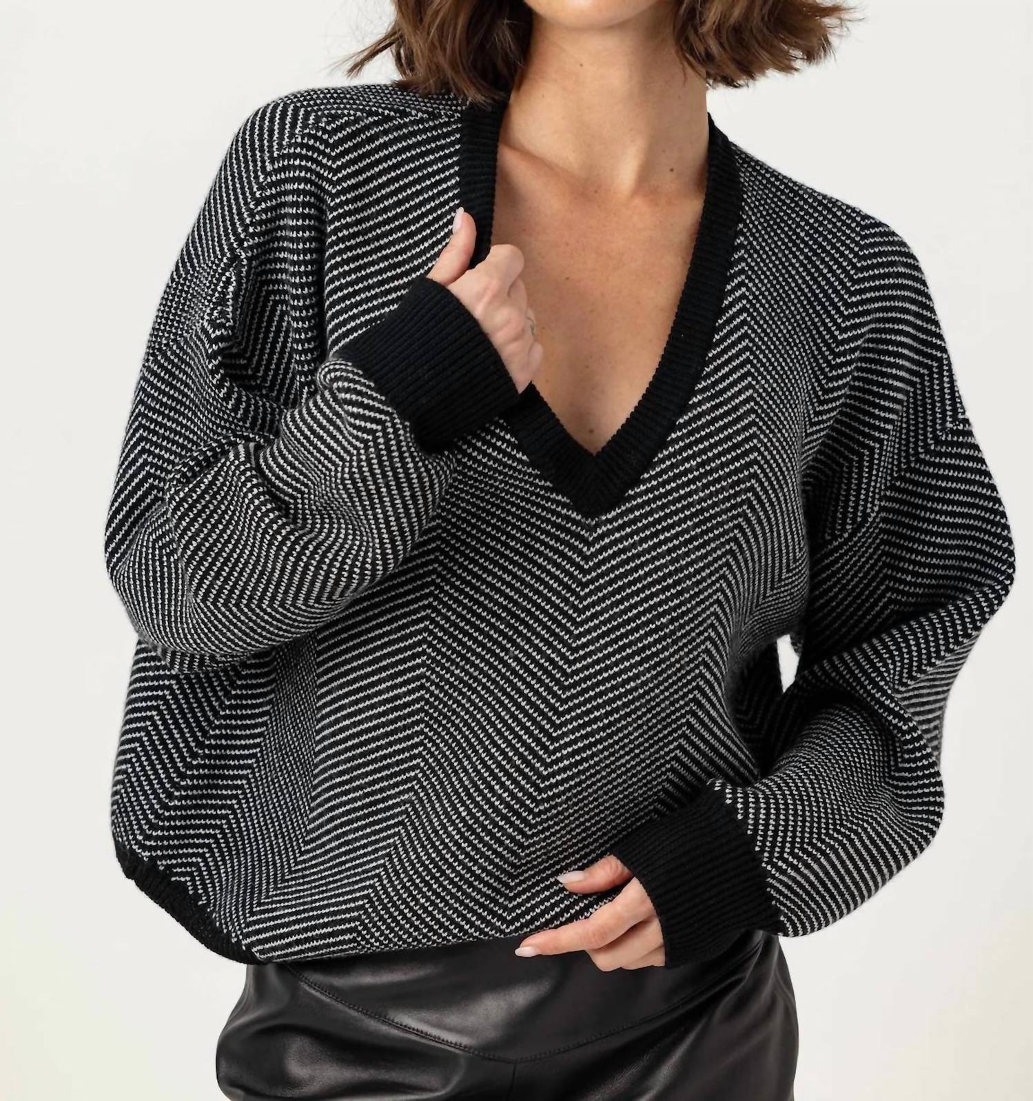 A timeless v-neck sweater that works season after season. Introducing the Cora Sweater by Sundays, an exquisite piece in a monochromatic herringbone pattern that beautifully complements its long sleeves and plunging V-neckline. Crafted from ultra-soft wool yarn with a cashmere hand feel, this sweater offers a luxurious touch against the skin. Its oversized fit provides a relaxed silhouette, and it can be styled with the Beaker Skirt for an effortlessly chic dinner party look. Closure is conveniently pull-on, adhering to minimalist trends for a seamless spring wardrobe addition.
