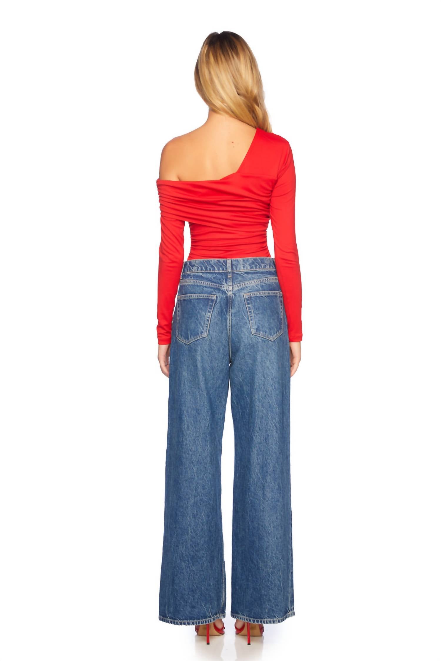 Pair this with your favorite jeans and slides for your next girls night out. Elevate your holiday party ensemble with the One Arm Off Shoulder Gathered Top by Susana Monaco, a striking piece in Perfect Red. This maximalist blouse showcases a long sleeve and an elegant off-the-shoulder neckline. Composition: 96% Nylon, 4% Spandex with a solid pattern. Closure: Pull on. Care: Machine wash. Ideal for making a bold statement at any festive gathering.