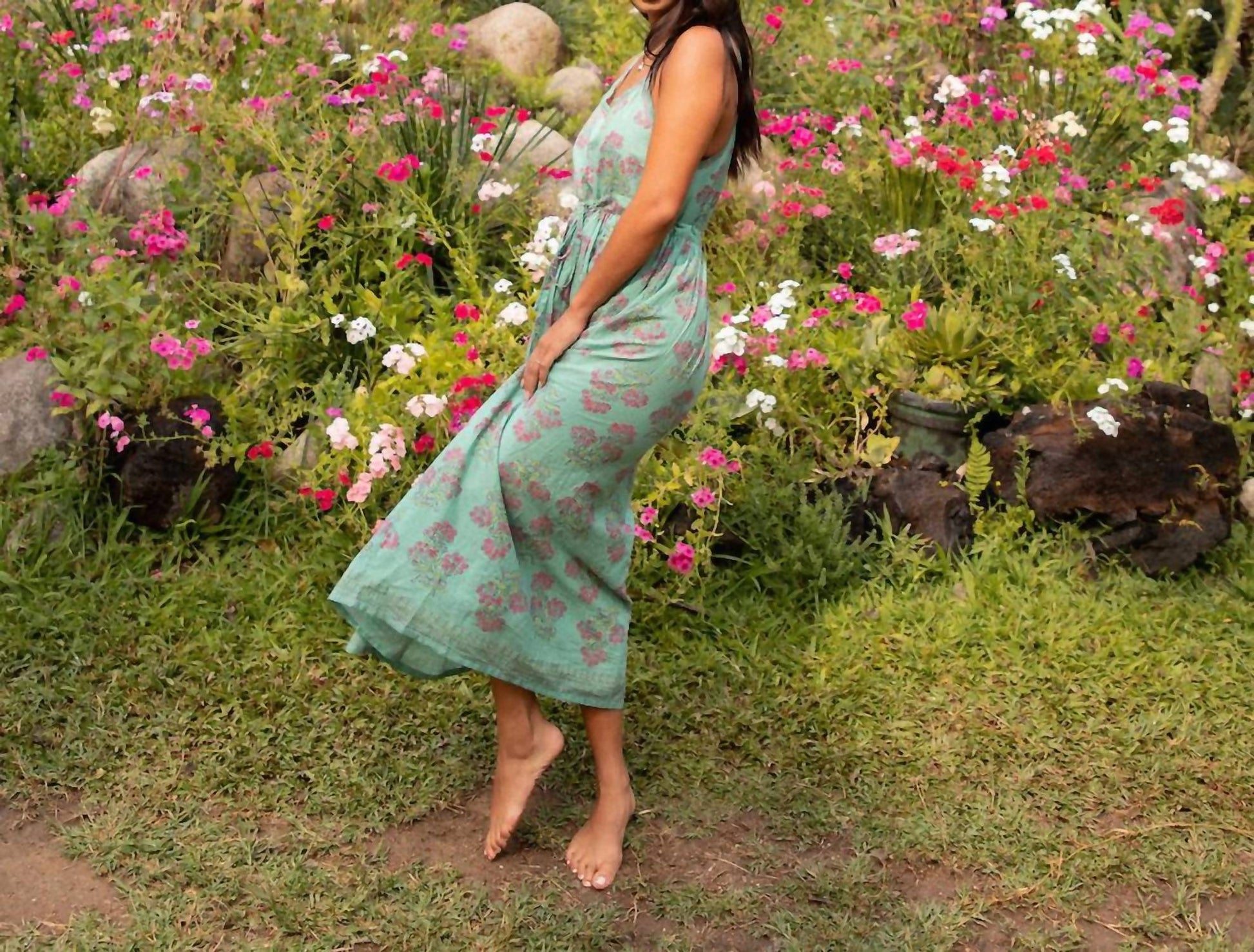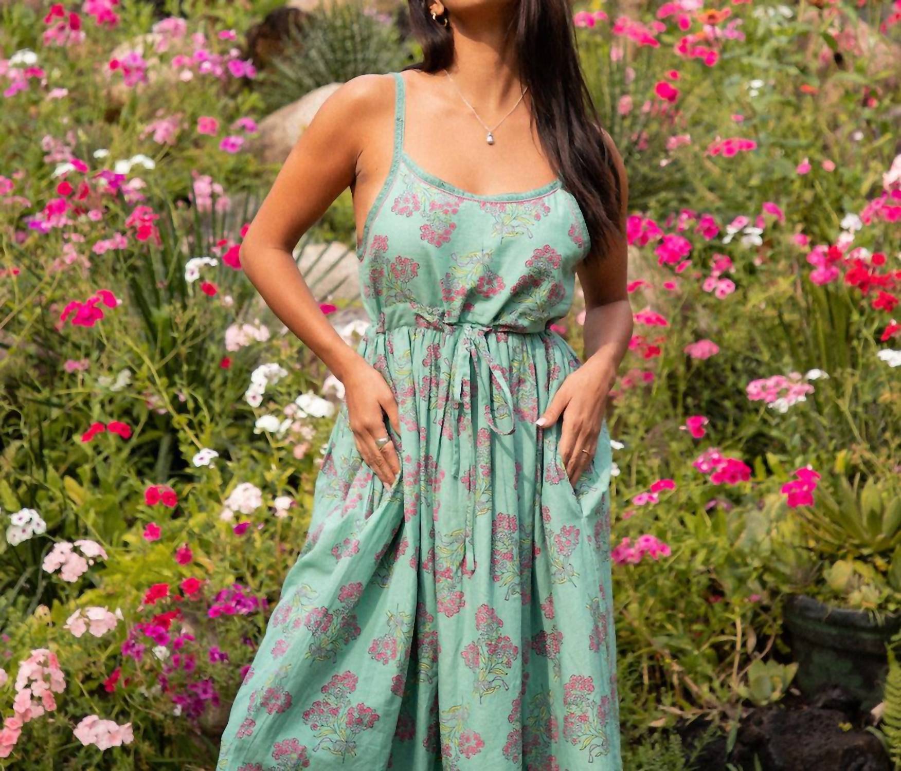 The perfect length dress does exist. Elevate your spring wardrobe with The Fox and The Mermaid's Hand-embroidered Amelia Midi Dress. This sleeveless cotton dress features a scoop neckline and showcases a captivating green and pink floral pattern, block printed by hand in Jaipur, India. Designed with a drawstring waist and adjustable straps, this midi dress includes hidden pockets for functionality and is double-lined for added comfort. Care: Hand wash cold. Closure: Pull on. Crafted from 100% cotton and adorned with pink hand embroidery, it's the perfect boho chic piece for holiday parties.