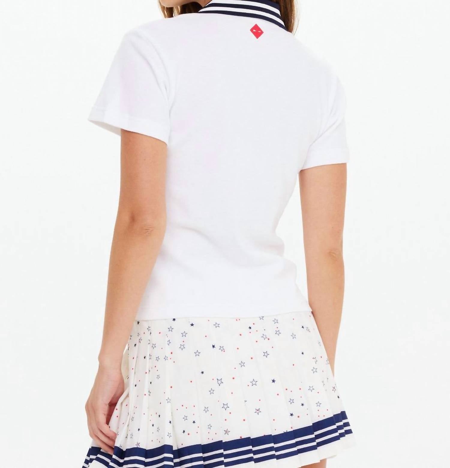 The short sleeve tee you'll want in every color. Elevate your vacation style with the Luma Zip Collared Polo by THE UPSIDE, a minimalist piece perfect for summer. This short sleeve polo crafted from organic cotton pique boasts a boxy shape for a chic, relaxed fit. It features a contrast navy rib collar and a front zip closure, complete with a rubber diamond arrow patch at the back neck. Care is simple with machine wash and line dry instructions, ensuring effortless maintenance.