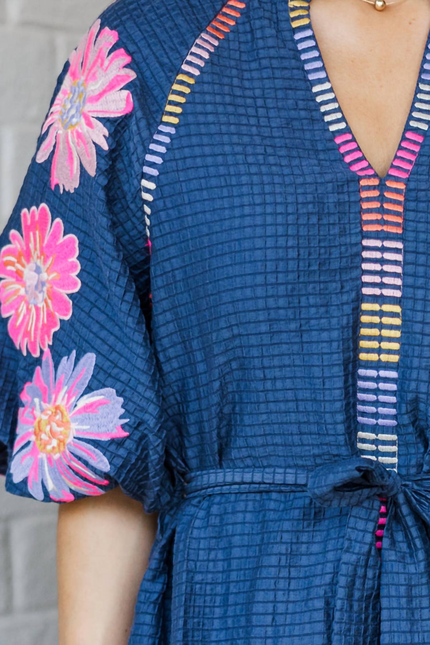 The perfect length dress does exist. Embrace elegance with the Flower Embroidered Dress by THML, perfect for a chic and playful vibe. This A-line midi dress features short puff sleeves, a V-neckline, and is crafted in a vibrant blue textured fabric with stunning floral embroidery. Designed without stretch, it includes a tied waist to cinch for a flattering silhouette. Ideal for vacation or delightful spring occasions.