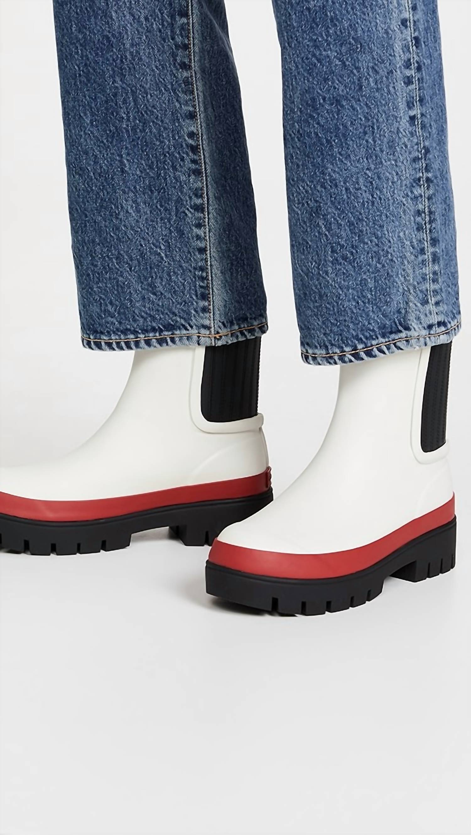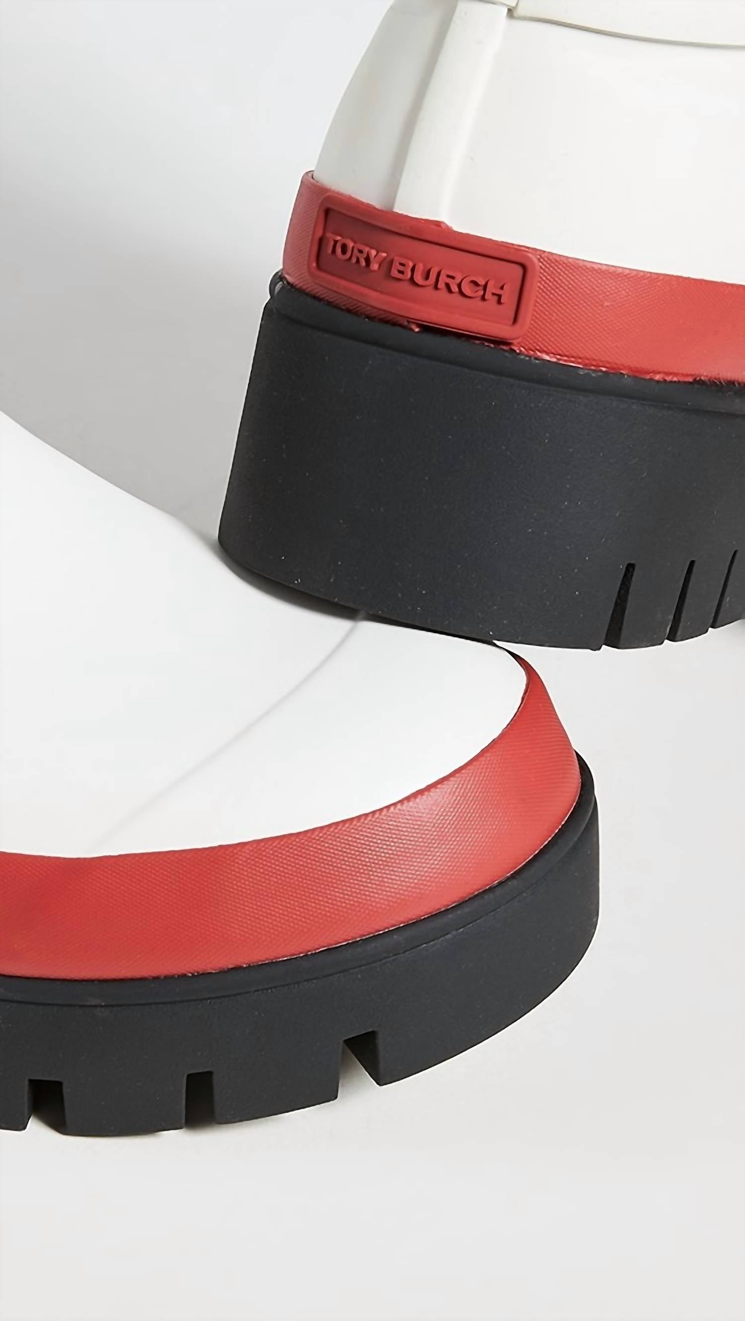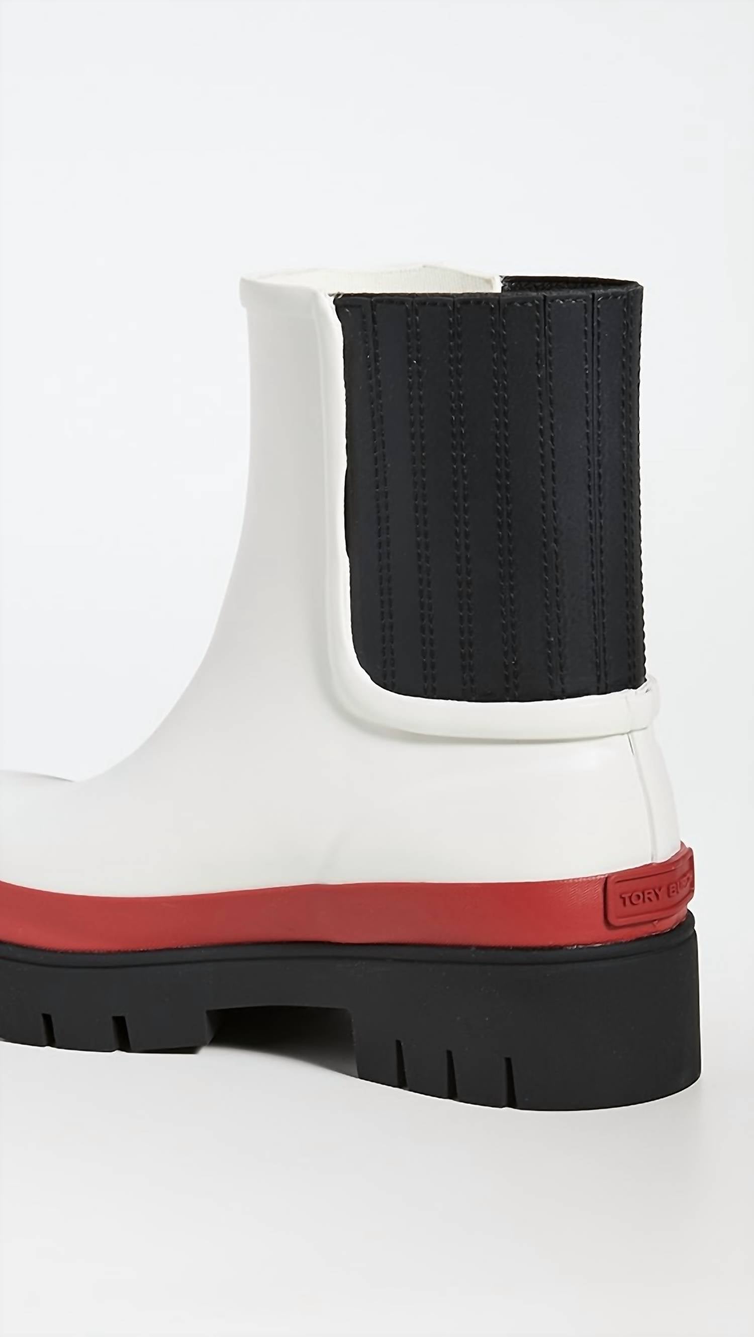 Say hello to the perfect, most versatile boot. The ankle height makes this style easily transition from day to night. Wear them with your favorite skinny jeans and tee for a more laid back look, or pair them with your favorite mini dress and jacket for a night out on the town. Step into style and protection with the Women's Foul Weather Boot by Tory Burch, designed in a chic New Ivory and black colorblock. Made from durable rubber with a pull-on design, these ankle boots host a rugged lug sole for superior traction. The platform measures 1 inch with a 1.5-inch heel, and the boot's shaft stands at 6.75 inches. Imported from China, these boots offer both functionality and fashion-forward appeal.