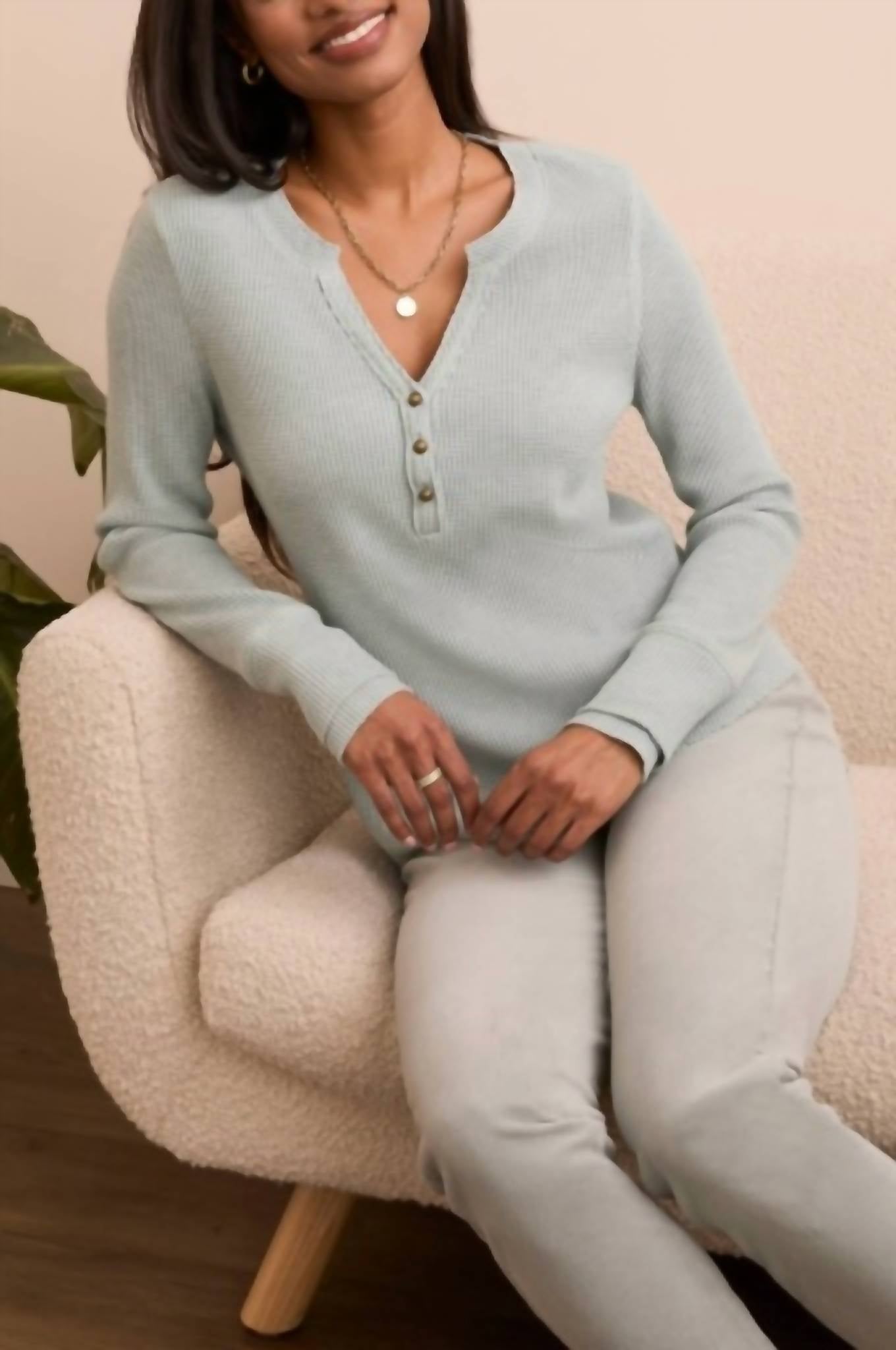 A long sleeve top you can wear with denim, skirts, well... just about anything! Introducing the Henley Long Sleeve Top by TRIBAL, a minimalist piece perfect for any fall occasion. Made with a blend of 43% Rayon, 34% Polyester, 19% Nylon, and 4% Spandex, this textured Silverpine top offers comfort and style. The long sleeves and V-neckline are complemented by a convenient button closure. Care instructions are simple: machine wash and tumble dry.