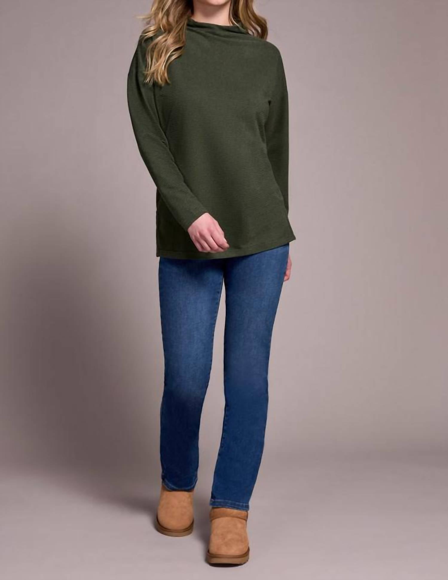 Embrace the versatility of this tunic-style blouse, expertly crafted for seamless layering or perfect to wear on its own. Its detailed design and comfortable fit make it a perfect addition to any closet. Elevate your fall wardrobe with the Ottoman Knit Drop Shoulder Cowl Neck Tunic by TRIBAL, an embodiment of cozy sophistication. Featuring long sleeves and a relaxed drop shoulder silhouette, this tunic is crafted from soft, structured polyester for a minimalist look in heather spruce. It boasts a flattering cowl neck and longer length, ideal for pairing with leggings or slim-fit pants. Closure: Pull on. Care instructions include machine wash on a normal cold cycle with like colors and tumble dry low, with low ironing if needed.