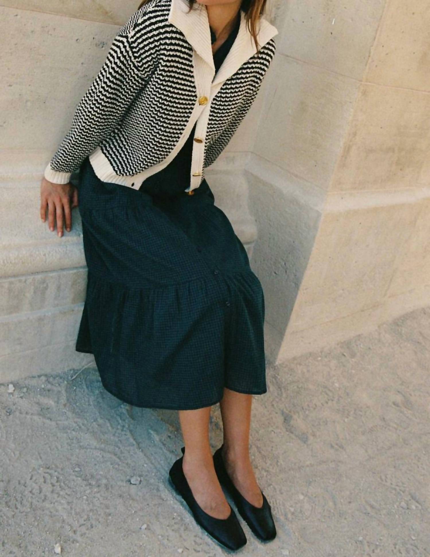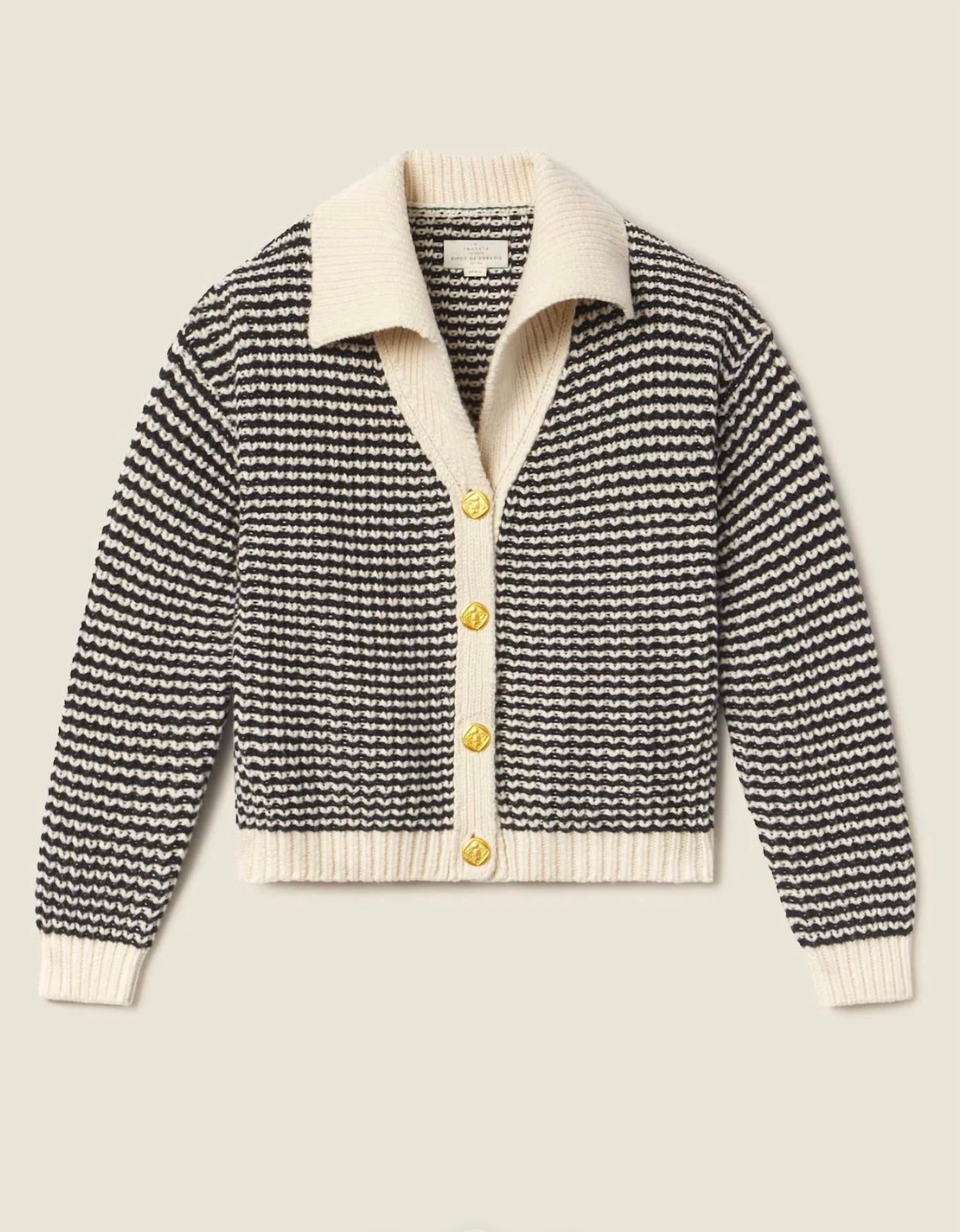 A classic fit that works just as good buttoned as it does left open. Discover the Savannah Long Sleeve Cardigan by TROVATA, a stylish piece perfect for a holiday party or spring outing. Its antique white and black stripe pattern features a textured basket weave with a charming cream sailor collar and cuffs, all made from luxurious merino wool. This cardigan is finished with distinctive gold owl buttons for added elegance. Easy to care for, simply machine wash and lay flat to dry for enduring wear.