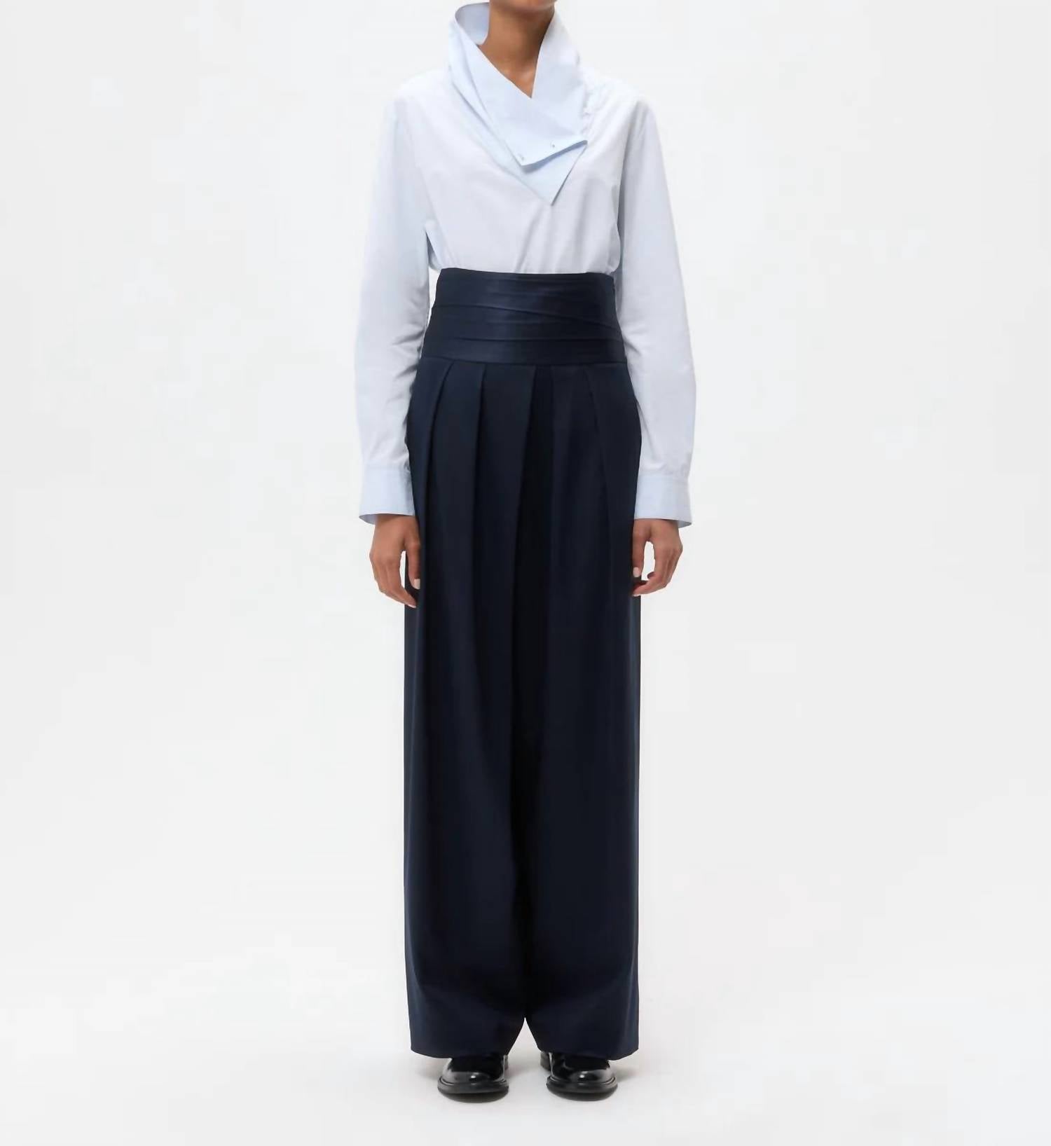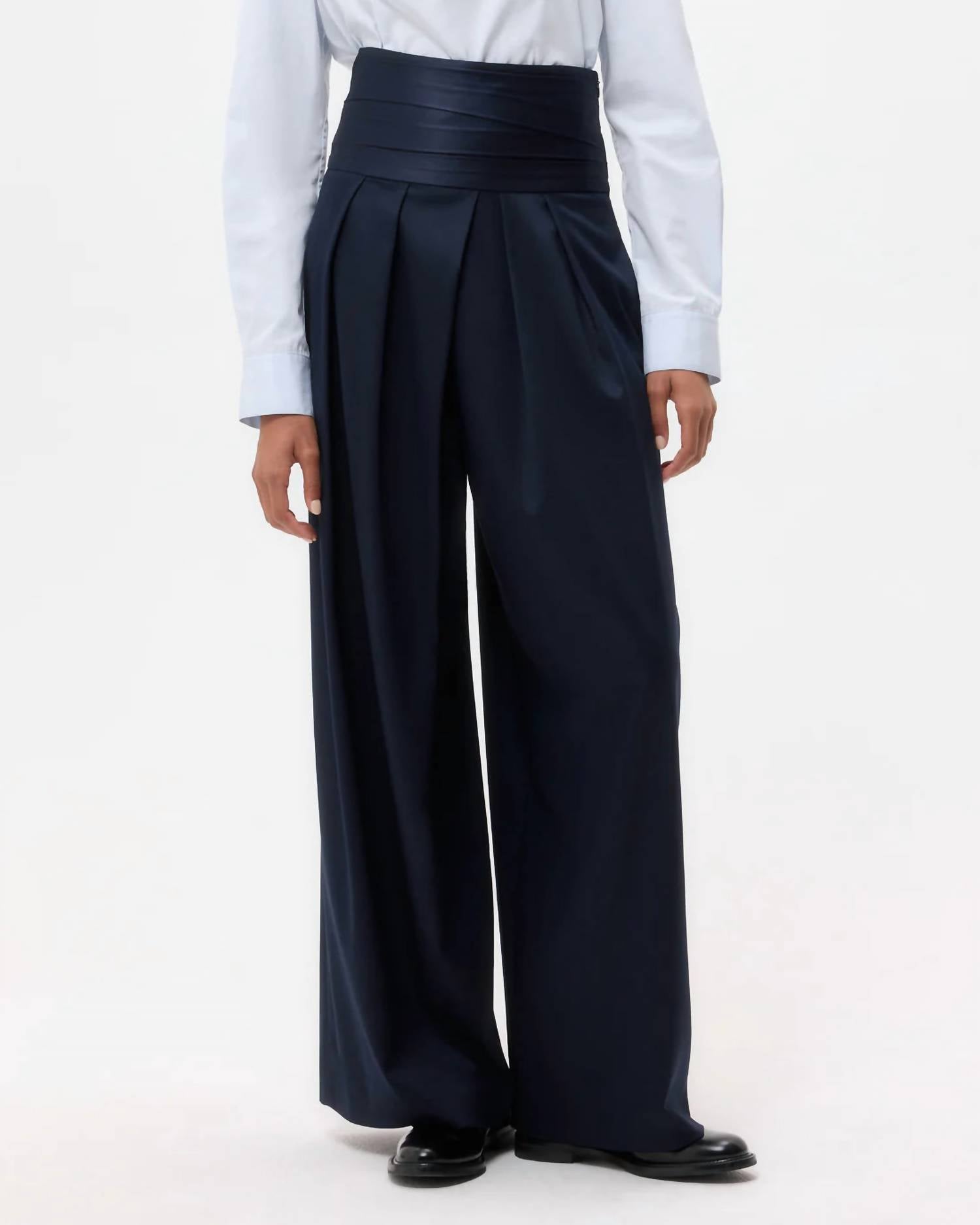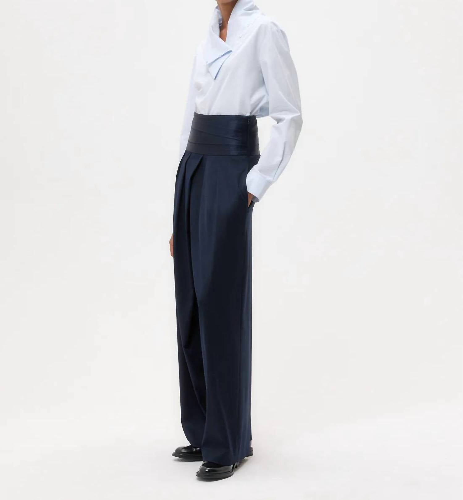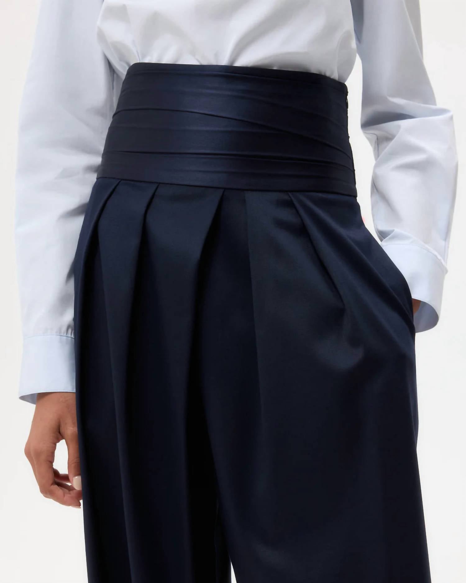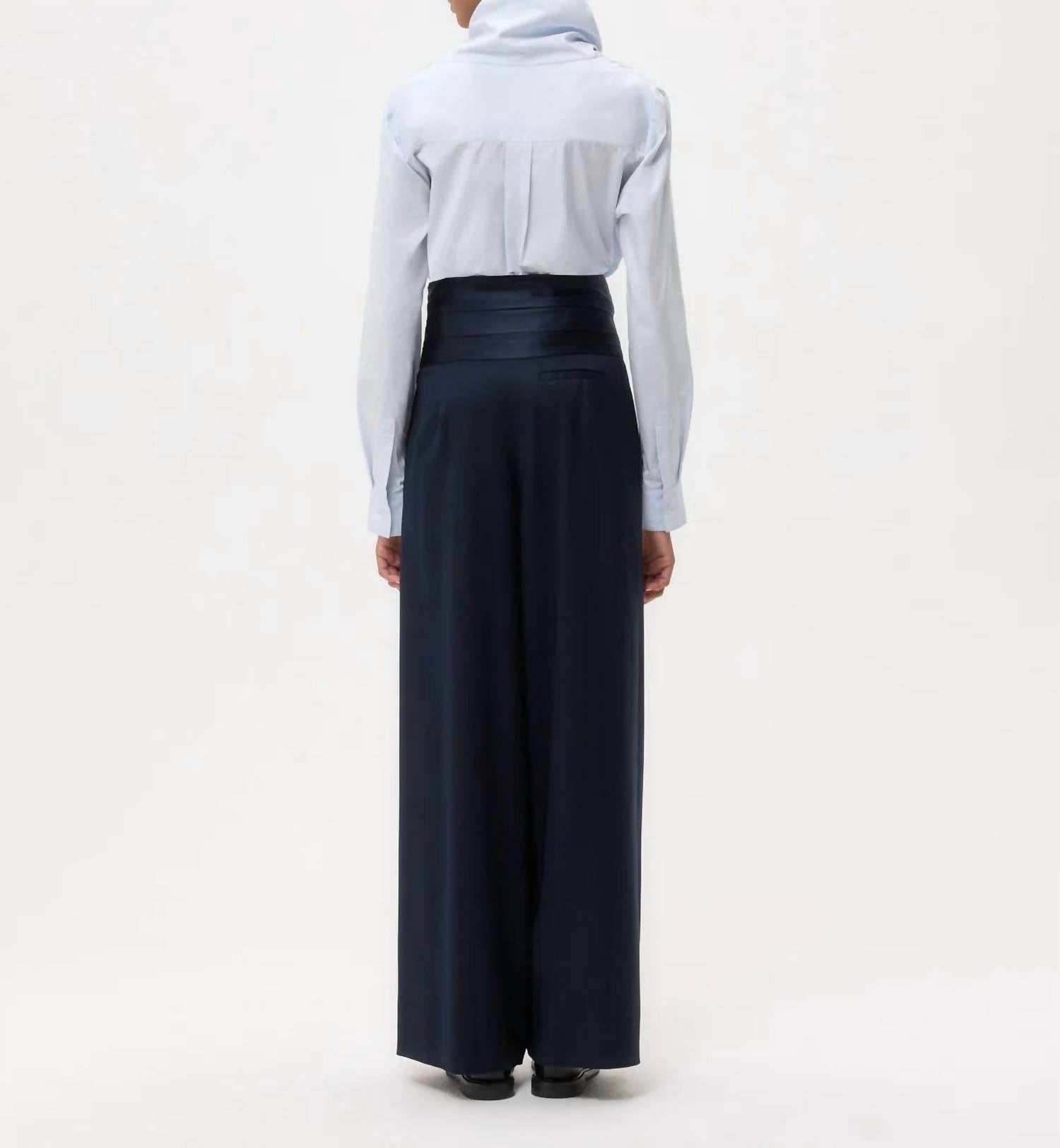 Elevate your formal wardrobe with the Delancey St Pants by TWP, tailored for sophistication in Midnight hue. These high-waisted, relaxed fit trousers are crafted from a luxurious viscose blend, featuring a 55% Viscose, 43% Wool, and 2% Elastane composition. Noteworthy for their silk charmeuse cummerbund waistband and satin trim, they promise both elegance and comfort. Ideal for a black-tie event, these trousers offer a concealed closure and practical pockets to complement your style.