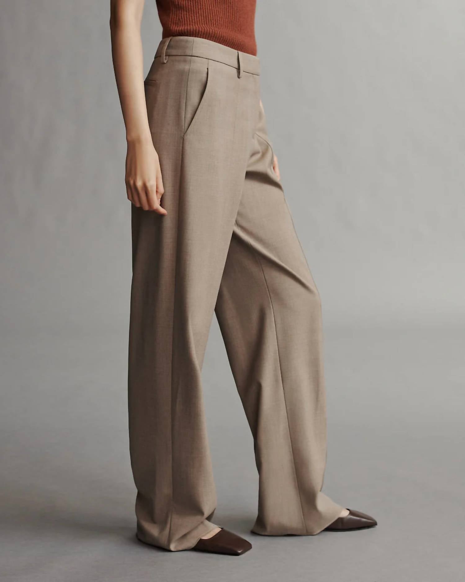Unveil elegant style with the Elizabeth Straight Leg Trouser by TWP, perfect for a sophisticated black-tie event this spring. These mid-rise trousers in a solid sandstone hue are crafted from a lightweight wool blend, comprising 96% Wool and 4% Elastane, offering a slim fit through the leg with distinguished front and side seams. Designed with practicality in mind, they include side pockets, concealed zip-fly, belt loops, and a secure hook-and-eye closure. Ideal for elevating any outfit, these trousers effortlessly combine functionality with refined style.