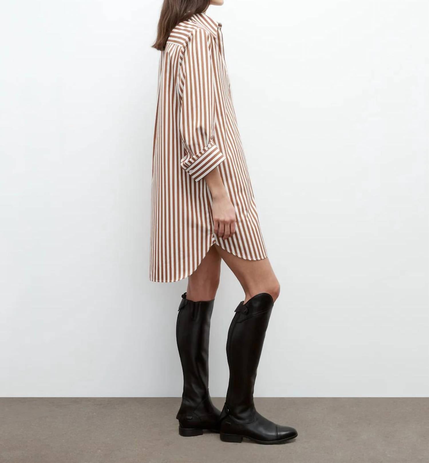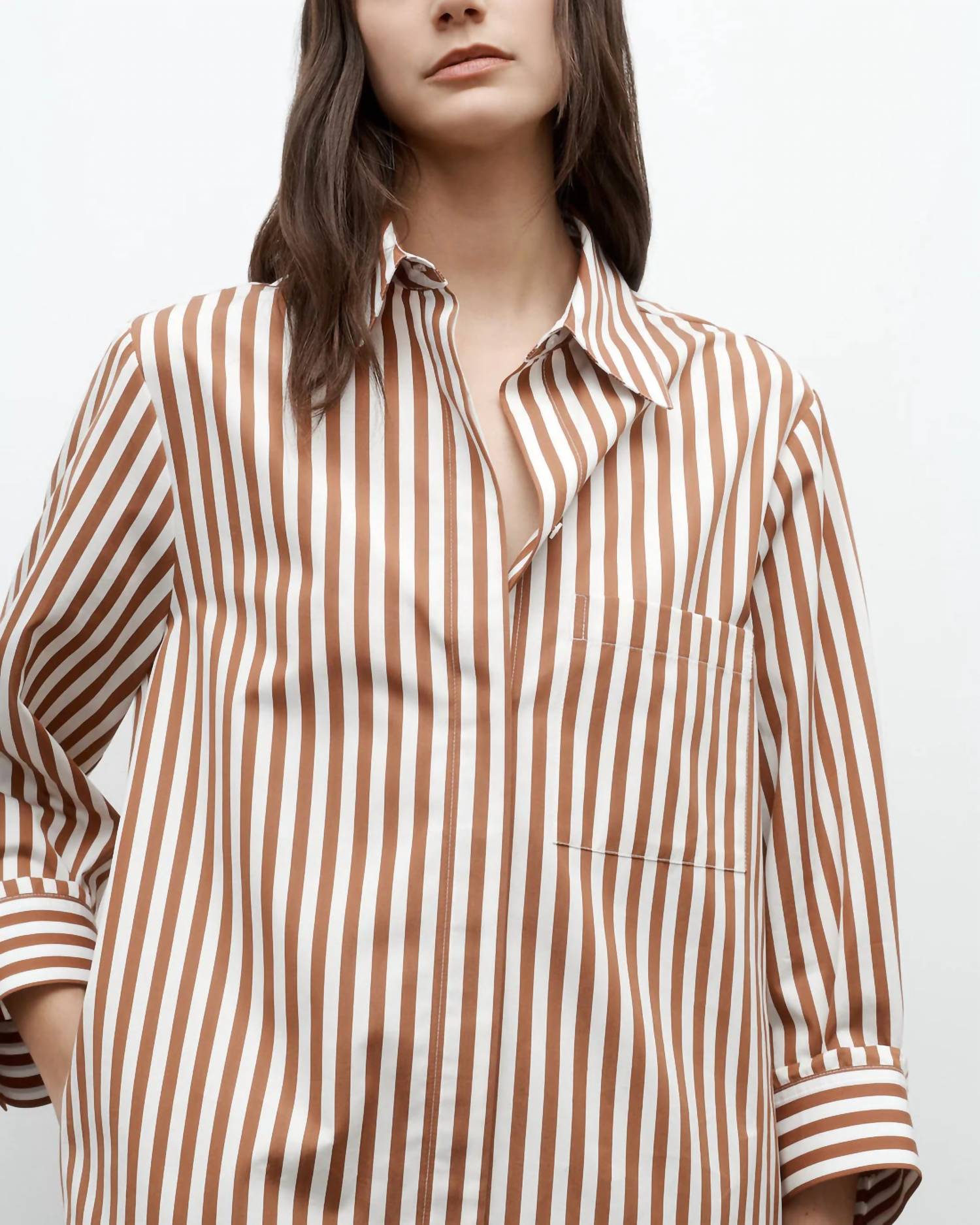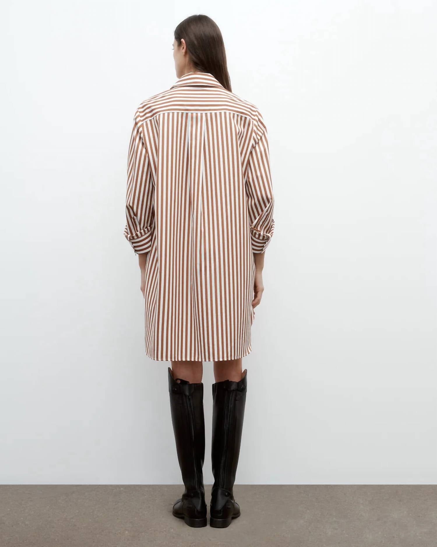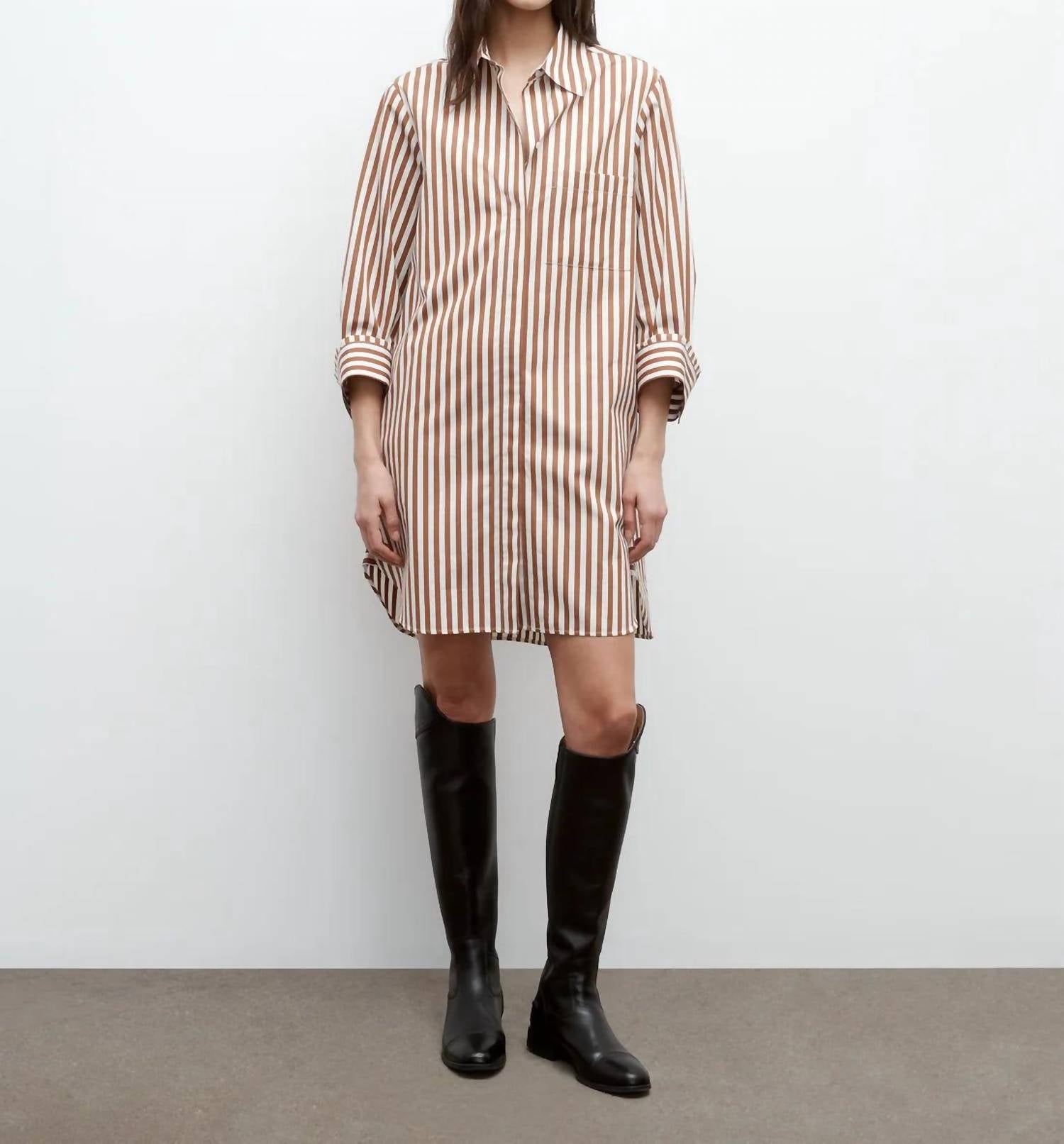 The perfect mini dress for those warmer months. Introducing the Morning After Dress by TWP, a chic option for a holiday party crafted from bold ivory and cognac striped Italian cotton. This mini shirt dress showcases long sleeves and a relaxed, boxy silhouette with a collar neckline. Closure: Concealed button closure. Material: 100% Cotton, designed with a chest patch pocket and signature wide rolled up button cuffs.
