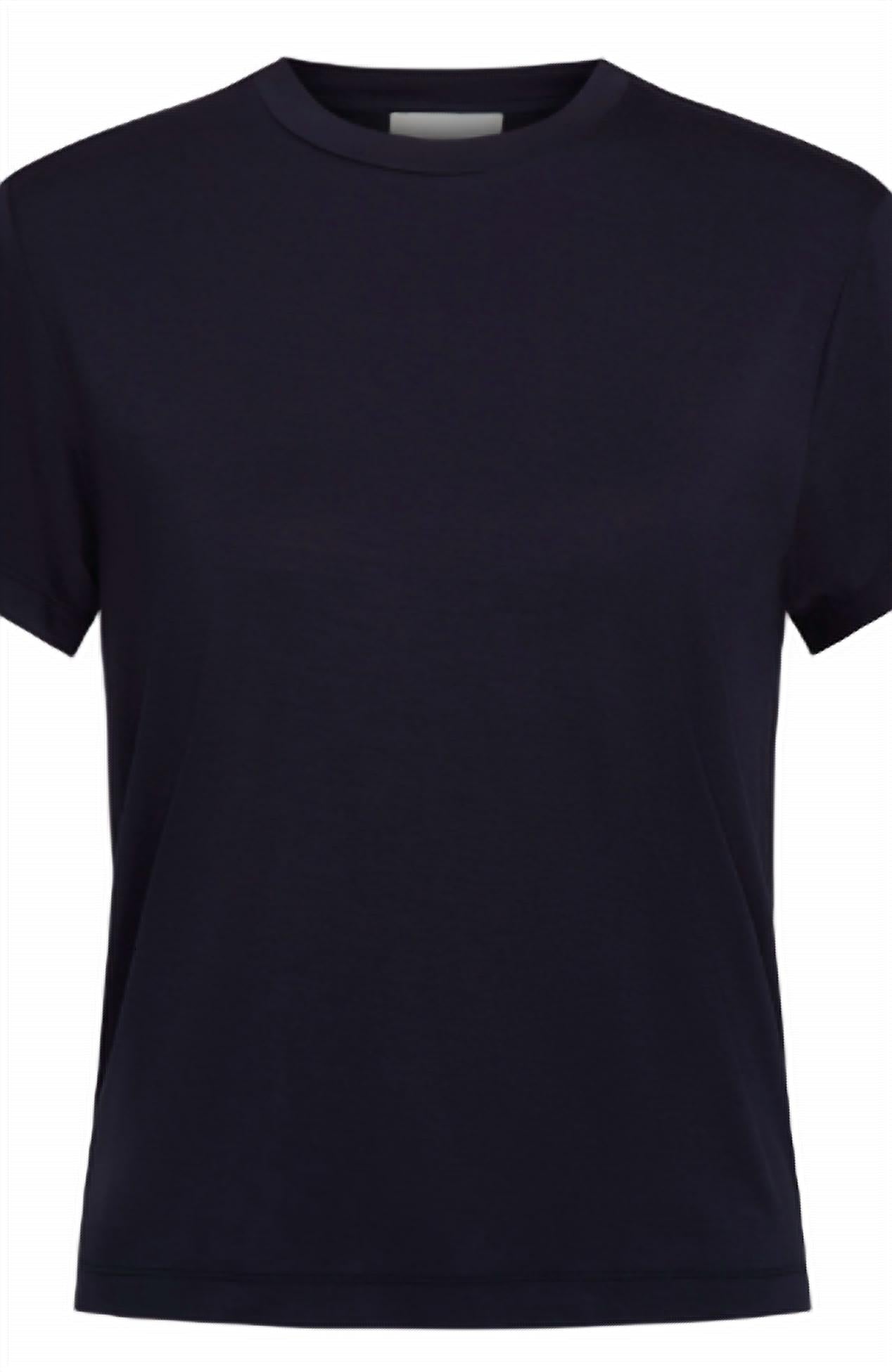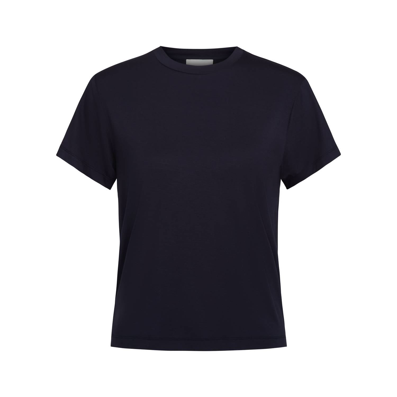 The short sleeve tee you'll want in every color. Discover effortless style with the Women's His Tee by TWP, a wardrobe staple in a chic solid Midnight hue. This short-sleeve t-shirt features a classic crewneck and offers a pull-on closure for easy wear. Crafted from 95% bamboo and 5% elastane, enjoy the ultra-soft, stretchy feel perfect for vacation and summer activities. Embrace the versatility of this piece, ideal for pairing with pleated pants or layering under an oversized shirt.