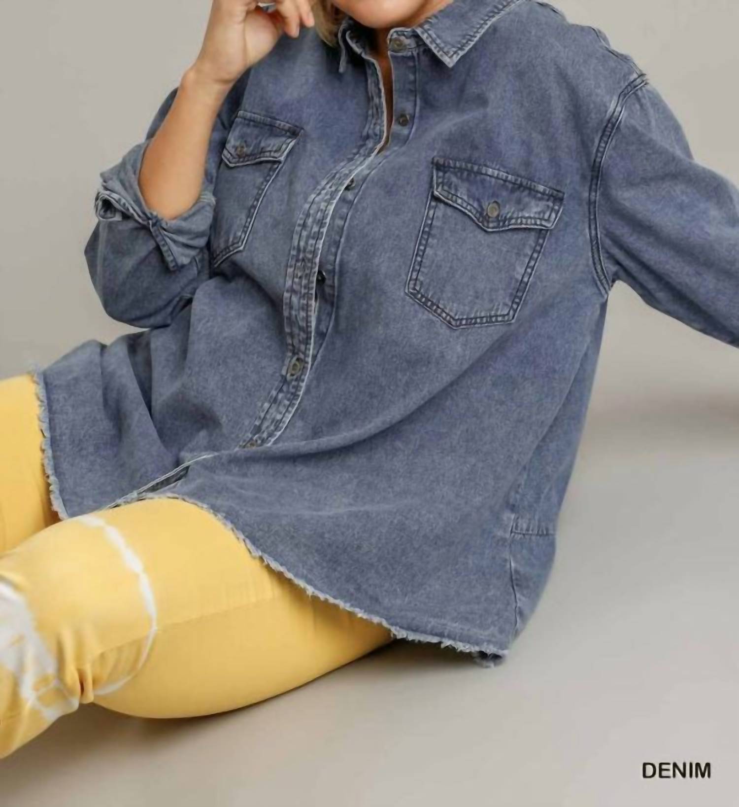 A jacket so versatile you can literally wear it with anything. Introducing the Umgee Button Down Denim Shacket, a versatile piece that can transition seamlessly from shirt to jacket. Designed with long sleeves and crafted from a stretchy cotton blend, this shacket features a classic collar, button closure, chest pockets, and a distinctive frayed high-low hem. Composition: 83% Cotton, 17% Spandex. Care: Hand wash or dry clean. Ideal for fall streetwear, this light to medium weight piece is perfect for adding a stylish touch to your wardrobe.