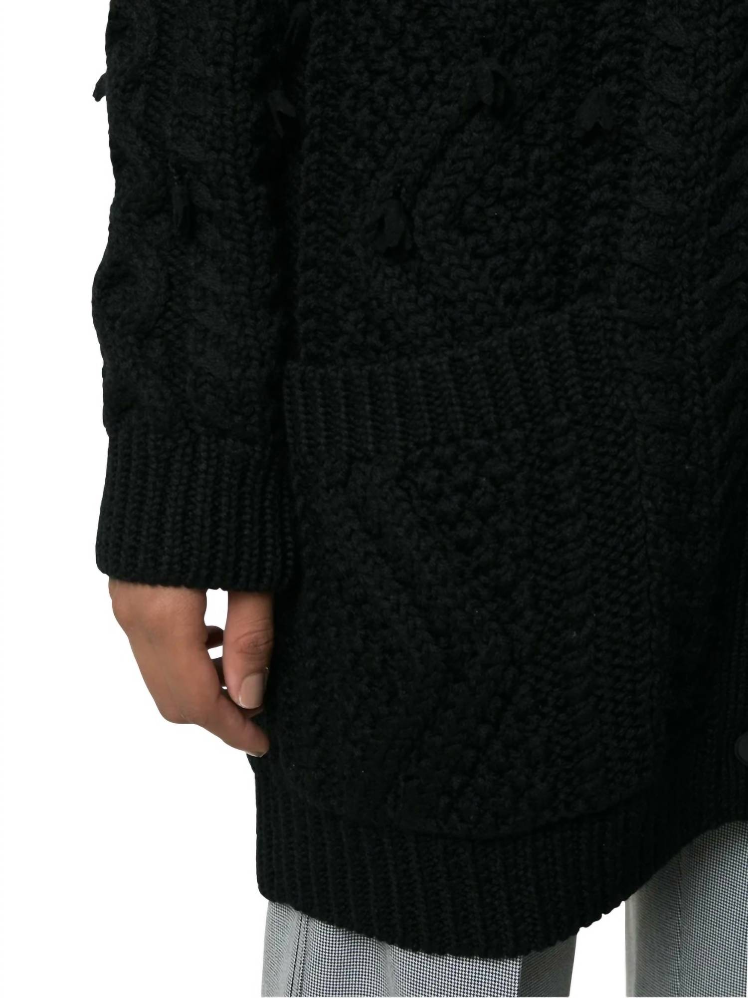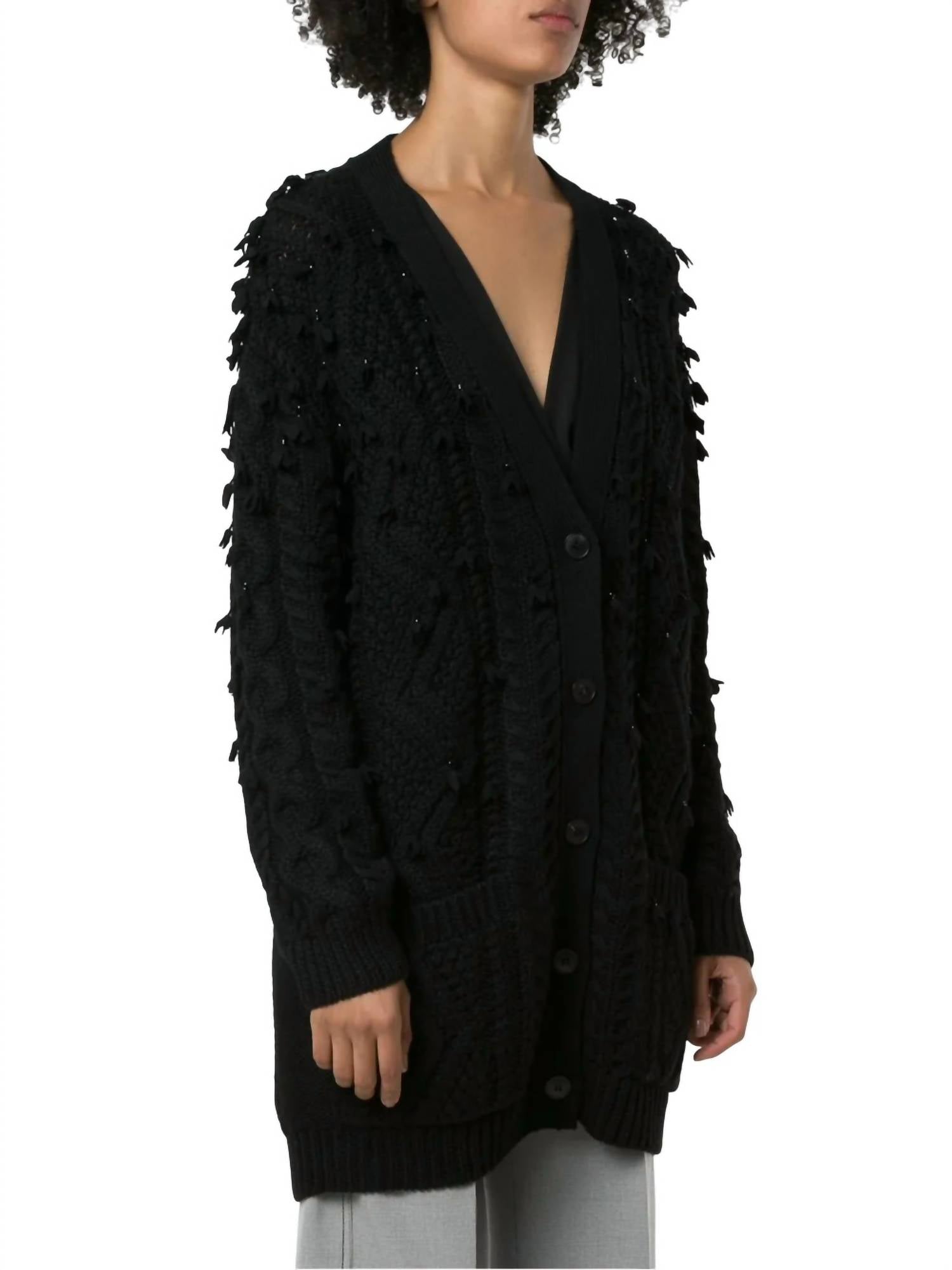 Throw this adorable cardigan over any cami or tank top. Introducing the Oversized Tassel-trim Cable-knit Cardigan by Valentino, a luxurious choice for winter elegance. This black cardigan features a long sleeve design crafted from 100% virgin wool, showcasing a traditional cable knit with ribbed detailing. Enhanced with a V-neckline, tassel trim, and a front button closure, it includes two side welt pockets for added utility. Made with meticulous attention to the Quiet Luxury trend, it's perfect for travel and New Year's Eve occasions. Model height: 1.77 m, wearing size S.