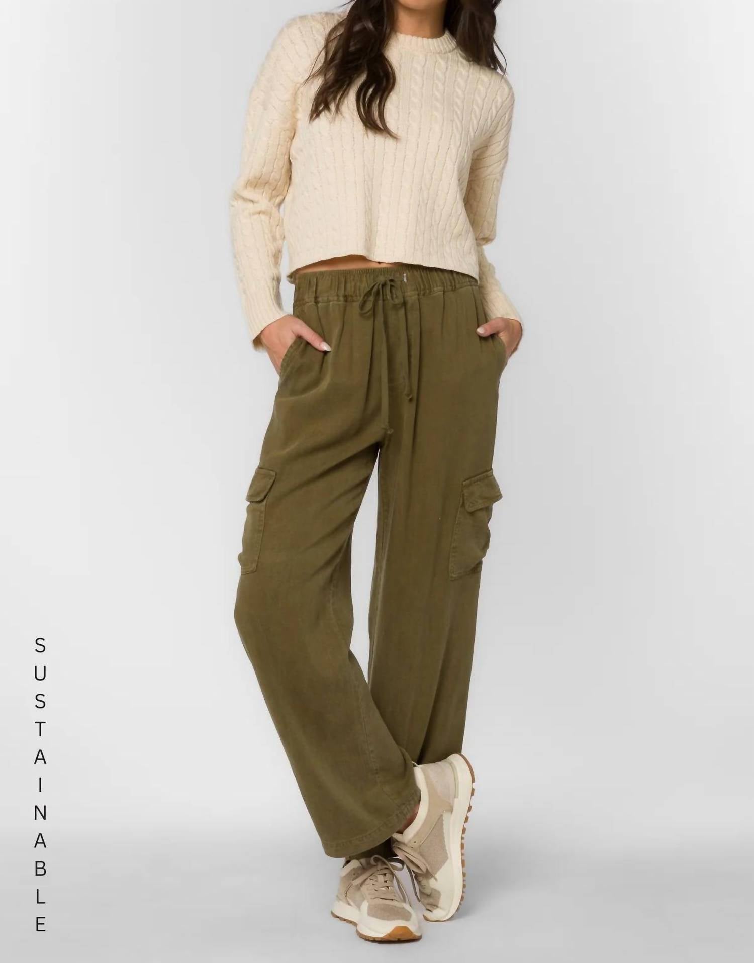 The Lynlee Drawstring Pants by Velvet Heart in vibrant Pesto Green offer a stylish blend of TENCEL™ Lyocell and Linen, perfect for breathable summer wear. These mid-rise, pull-on wide-leg pants feature an elastic drawstring waist, providing a relaxed fit ideal for vacation or athleisure looks. Thoughtfully designed with side seam pockets, cargo pockets, and back patch flap pockets with button closures, they combine function with fashion. Care: Machine wash cold, line dry for easy maintenance.