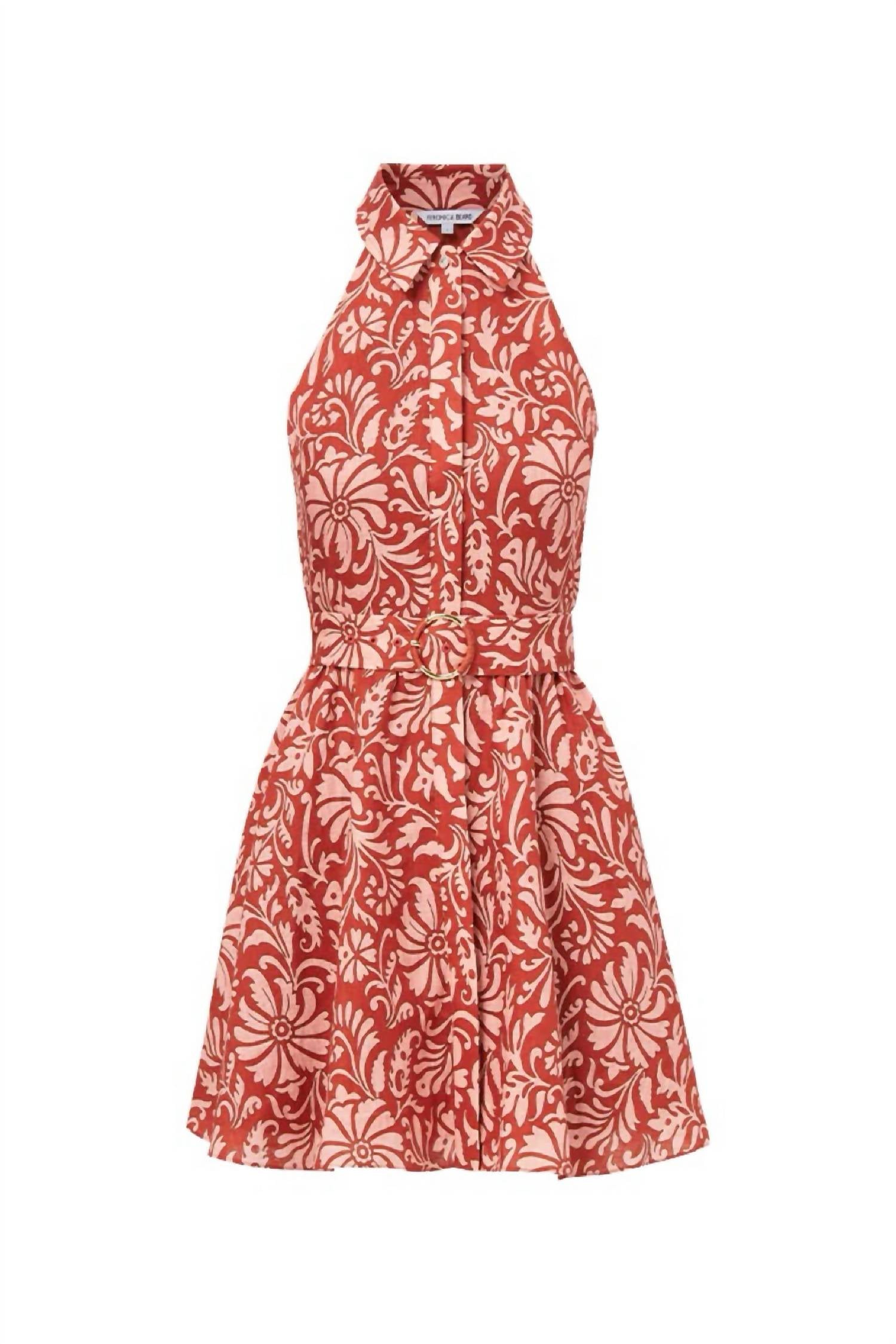 A short and breezy dress for those warmer days. Elevate your cocktail party ensemble with the Veronica Beard Beau Linen Mini Dress, in a captivating Persimmon Multi floral pattern. This sleeveless dress is crafted from 100% linen with a polyester lining, featuring a chic A-line fit-and-flare silhouette enhanced by an O-ring belt. Closure: Button closure. Care: Dry clean only. Perfect for boho-chic summer occasions like Valentine's Day, this piece exudes elegance with its lightweight fabric and collar neckline.