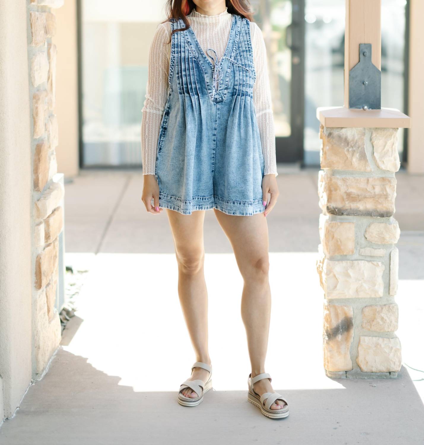 The perfect outfit choice when you you need something quick to throw on and still want to look efforlessly cool. Introducing the Front Pleated V Neck Sleeveless Denim Romper by Veveret, a chic addition to your summer wardrobe in a medium wash. This solid-colored romper features a deep V-neck with a string tie and handy side pockets for convenience. Expertly crafted from 100% cotton with a mini length silhouette, this piece boasts pleated detail on the back. It is imported and should be hand washed cold. The model is 5'10" and is wearing a size small, with the fit running a bit oversized.