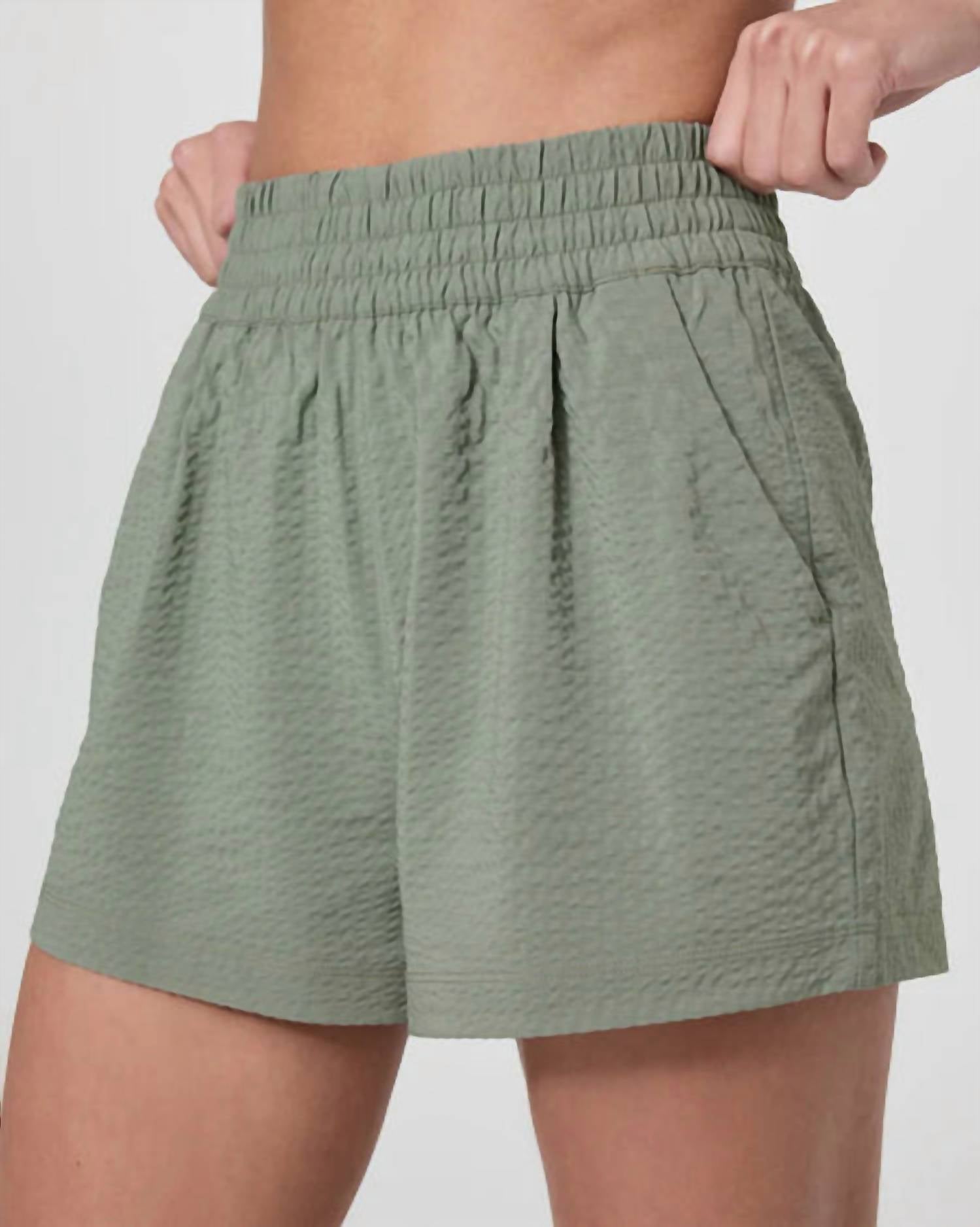 Fit to perfection, we love these high-waist shorts and you will too. Introducing the Villa Textured Short by Vuori, a perfect minimalist addition to your summer wardrobe in a chic Laurel hue. Designed with a high waist, these shorts offer a textured pattern and a convenient pull-on closure. Crafted from 75% recycled polyamide and 25% elastane, they feature an inseam of 4 inches and provide both comfort and style. Enjoy practicality with pockets, and easy maintenance with machine wash and tumble dry care instructions.