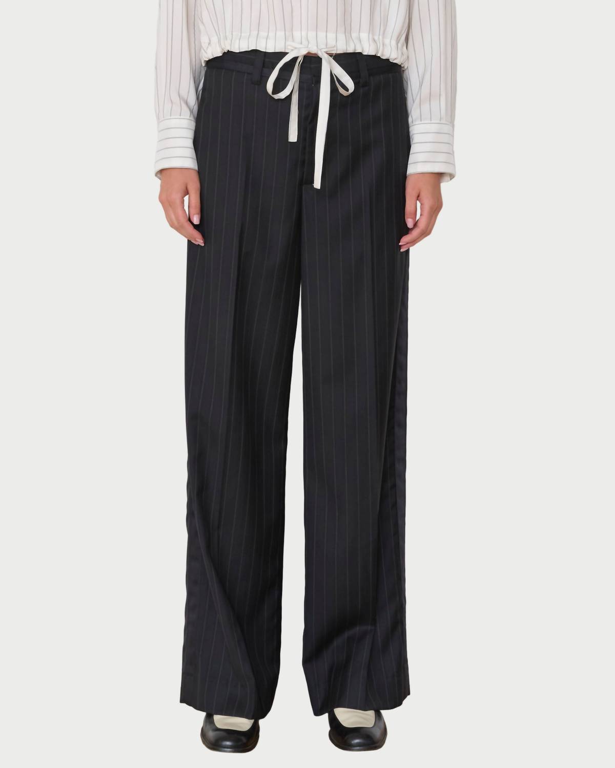 Discover the Tuxedo Trouser by WE-AR4, an iconic piece in a sophisticated black stripe, blending minimalist trends with timeless charm. Crafted from a luxurious wool blend fabric, this trouser features a wide-leg silhouette, mid-rise waist, and a sleek satin ribbon running down each leg for a touch of elegance. Zip closure ensures a seamless fit, and the design boasts pockets for practicality. Care: Dry clean only. With only 48 units produced, this limited edition piece is a testament to refined elegance, perfect for your engagement or Thanksgiving celebration.