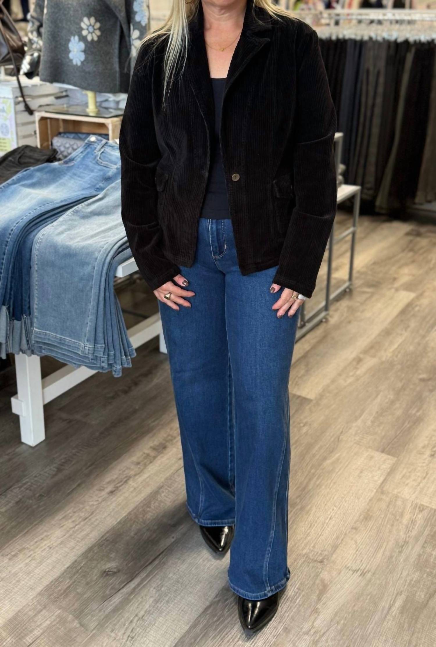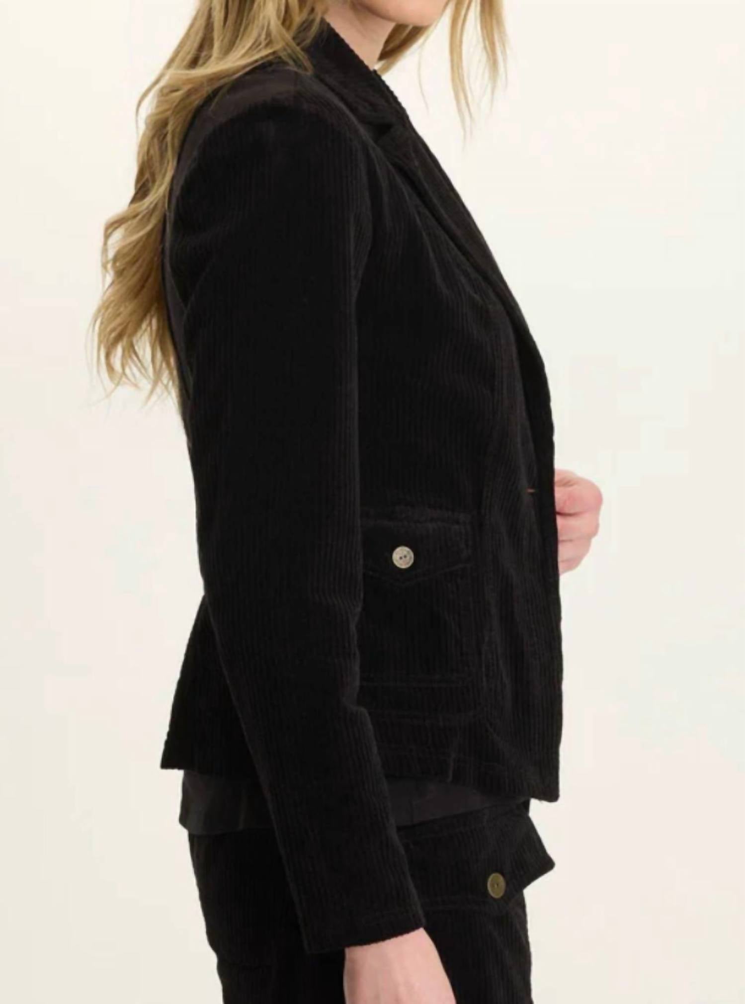 An elevated version of your favorite classic blazer. Meet the Aila Blazer Jacket by Wearables, a sophisticated addition to your wardrobe. Crafted with a blend of 98% Cotton and 2% Spandex and featuring 2x1 rib inserts made of 95% Cotton and 5% Spandex, this jacket offers comfort with a touch of stretch. With a center front of approximately 21" and a back of 22", this preshrunk jacket ensures a flattering fit. Its classic midnight black hue pairs perfectly for a dinner party, while a button closure and long sleeves complete the elegant workwear look. Care for this timeless piece with ease; it's machine washable.