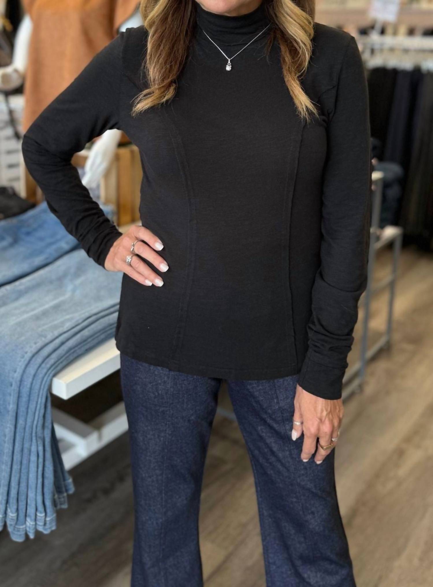 The perfect long sleeve tee that goes with just about anything. Elevate your vacation wardrobe with the Kari Jersey Mock Neck Peplum Top by Wearables in Classic Midnight Black. Designed with long sleeves and a chic mockneck, this minimalist long-sleeved tee brings a touch of elegance to any look. Crafted from a comfortable blend of 57% cotton, 38% modal, and 5% spandex, it features a peplum style with a flattering center front length of approximately 20.75 inches and a back length of 21.75 inches. Easy to wear with a pull-on closure and fully machine washable, it's a preshrunk piece that ensures the perfect fit every time.