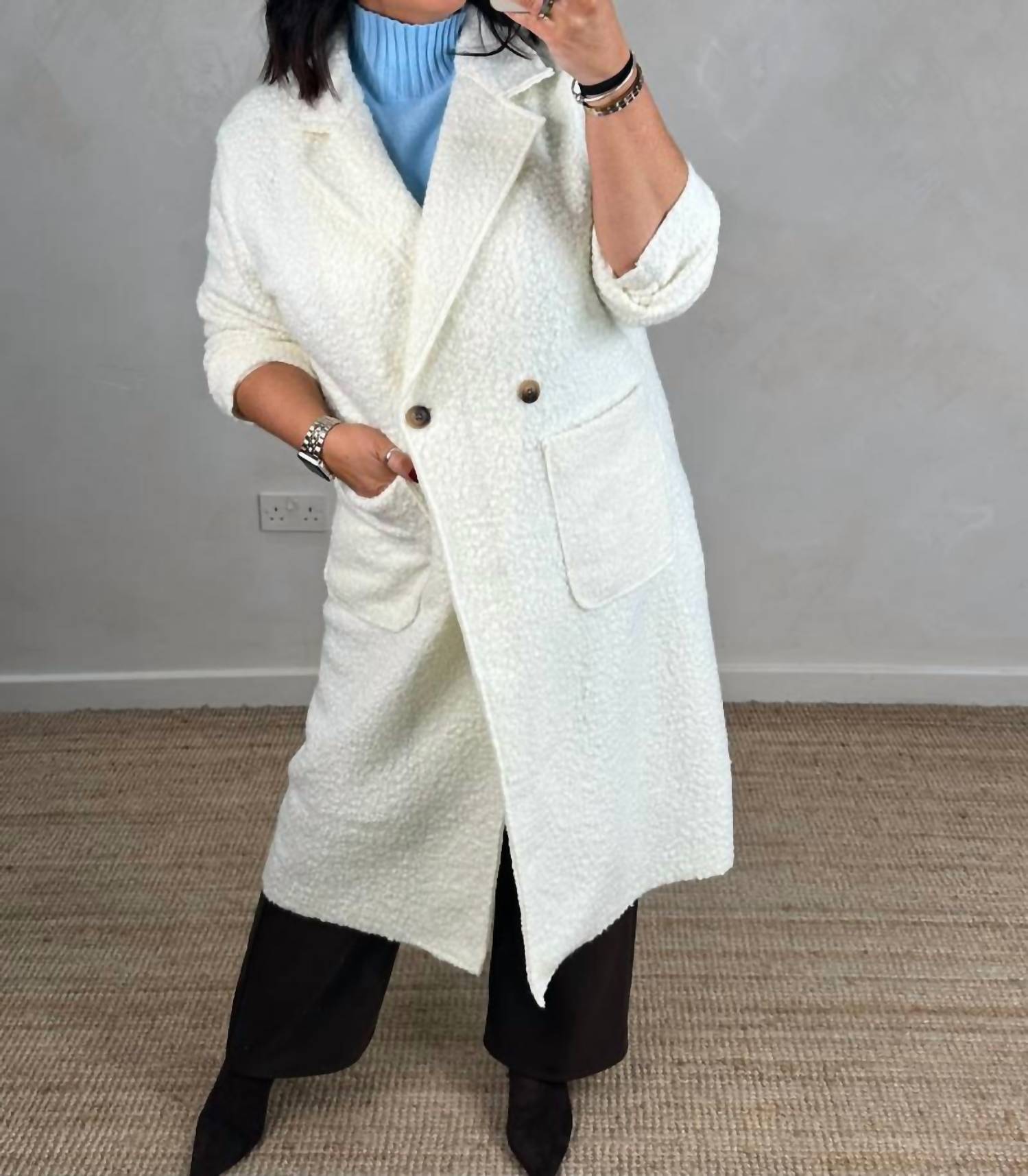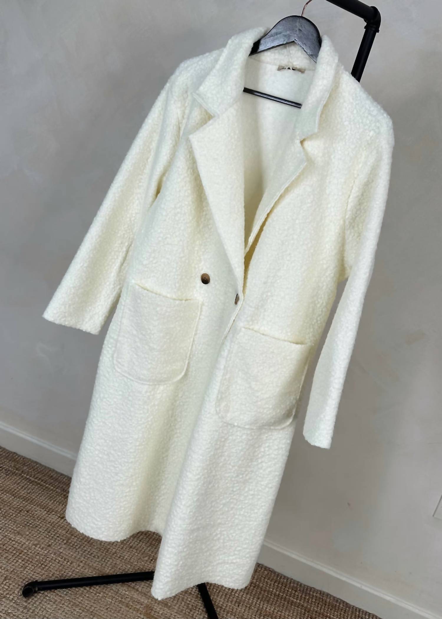 Downright adorable and so comfortable you won't want to take it off. This teddy jacket is a fan favorite. Elevate your winter wardrobe with the Hannah Long Sherpa Coat by Yolly. This women's teddy jacket in timeless white is crafted from textured faux fur, ensuring both style and warmth. Featuring long sleeves and a classic collar, it combines functionality with fashion, thanks to its button closure and practical pockets. Perfect for holiday parties, this vintage-inspired coat captures the festive spirit while offering endless styling possibilities.