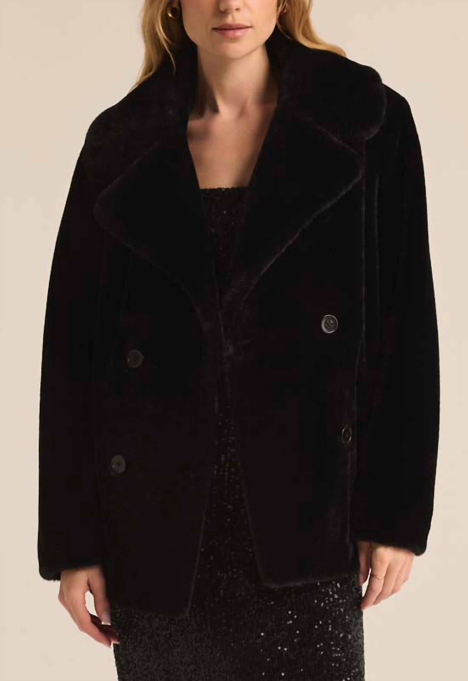 A jacket so versatile you can literally wear it with anything.  Featuring a double-breasted design and plush black fur, this coat exudes elegance and sophistication. Stay warm and stylish in this exquisite piece. Shell: 100% Poliyester. Lining: 100% Poliyester.