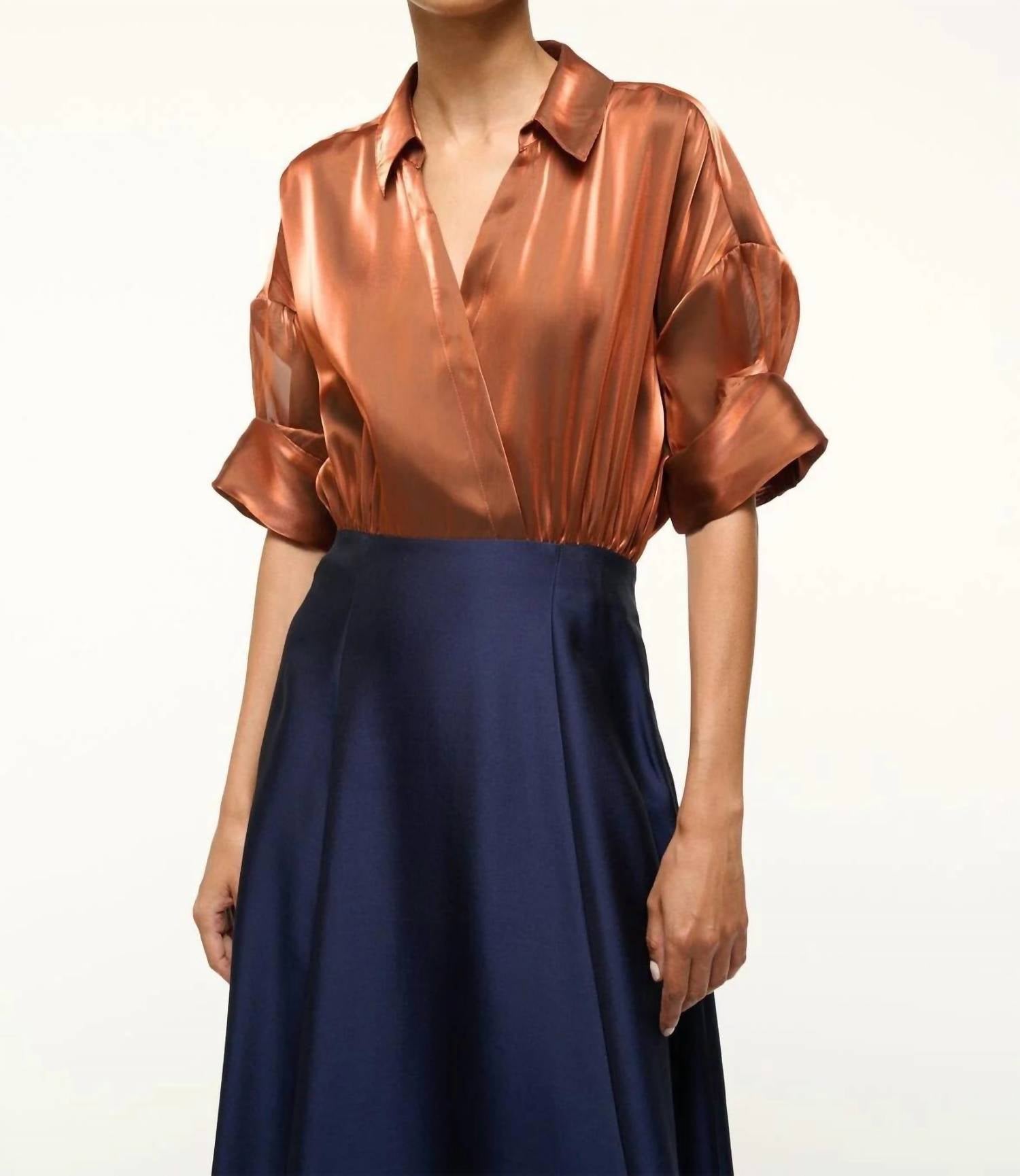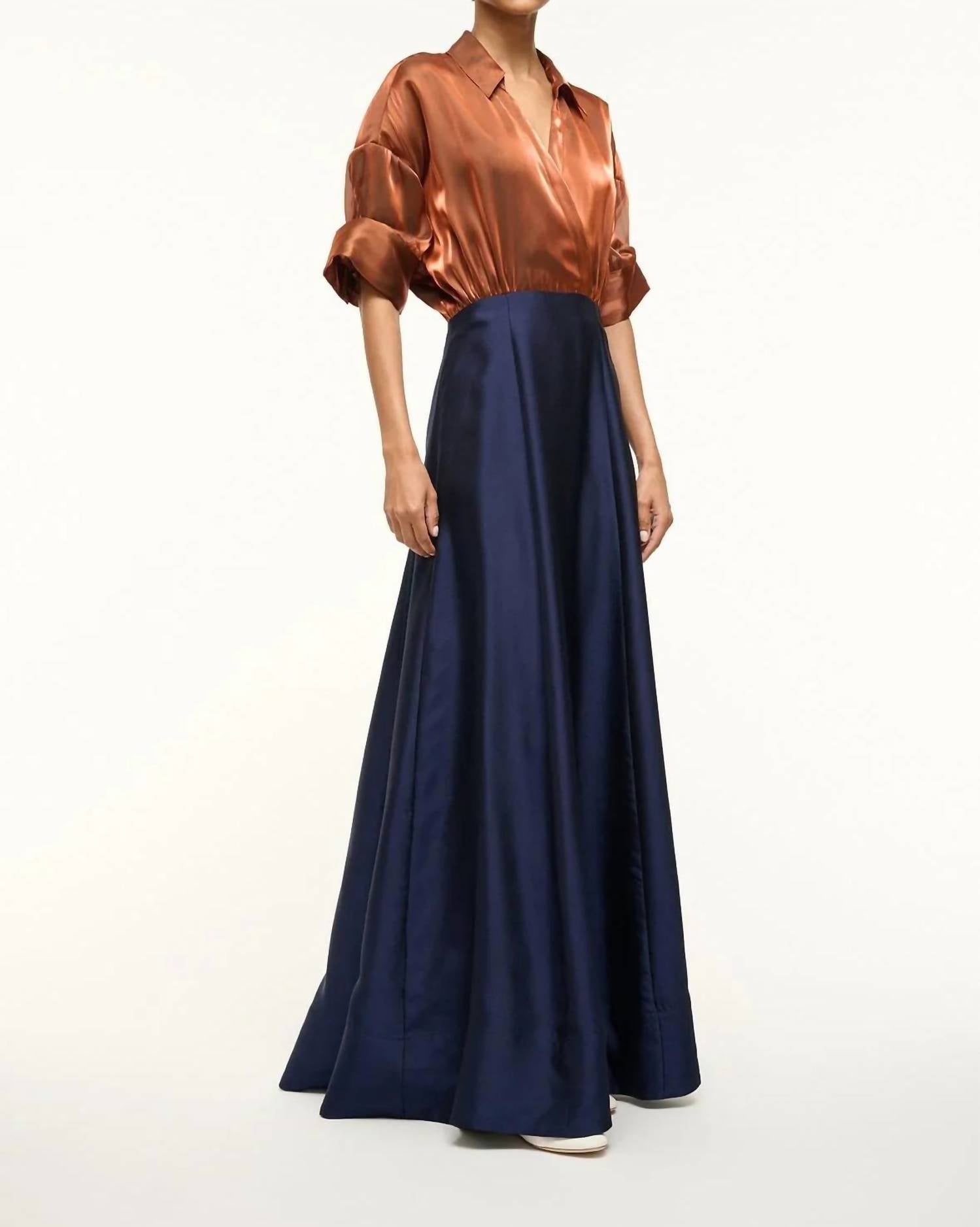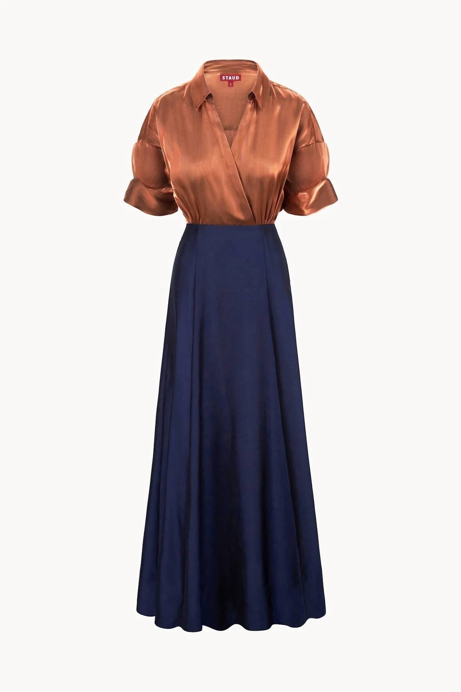 A maxi dress that is just as cute as it is comfortable. Stunning piece in Iridescent Cacao Midnight designed for elegant occasions. Mixed media gown. Features a top composed of 48% Wool, 32% Viscose, and 20% Silk, paired with a 100% Polyester maxi skirt. Creating an enchanting layered effect. With an elbow sleeve length, pull-on closure, and sophisticated collar neckline. Embodies refined elegance. Dry clean only.