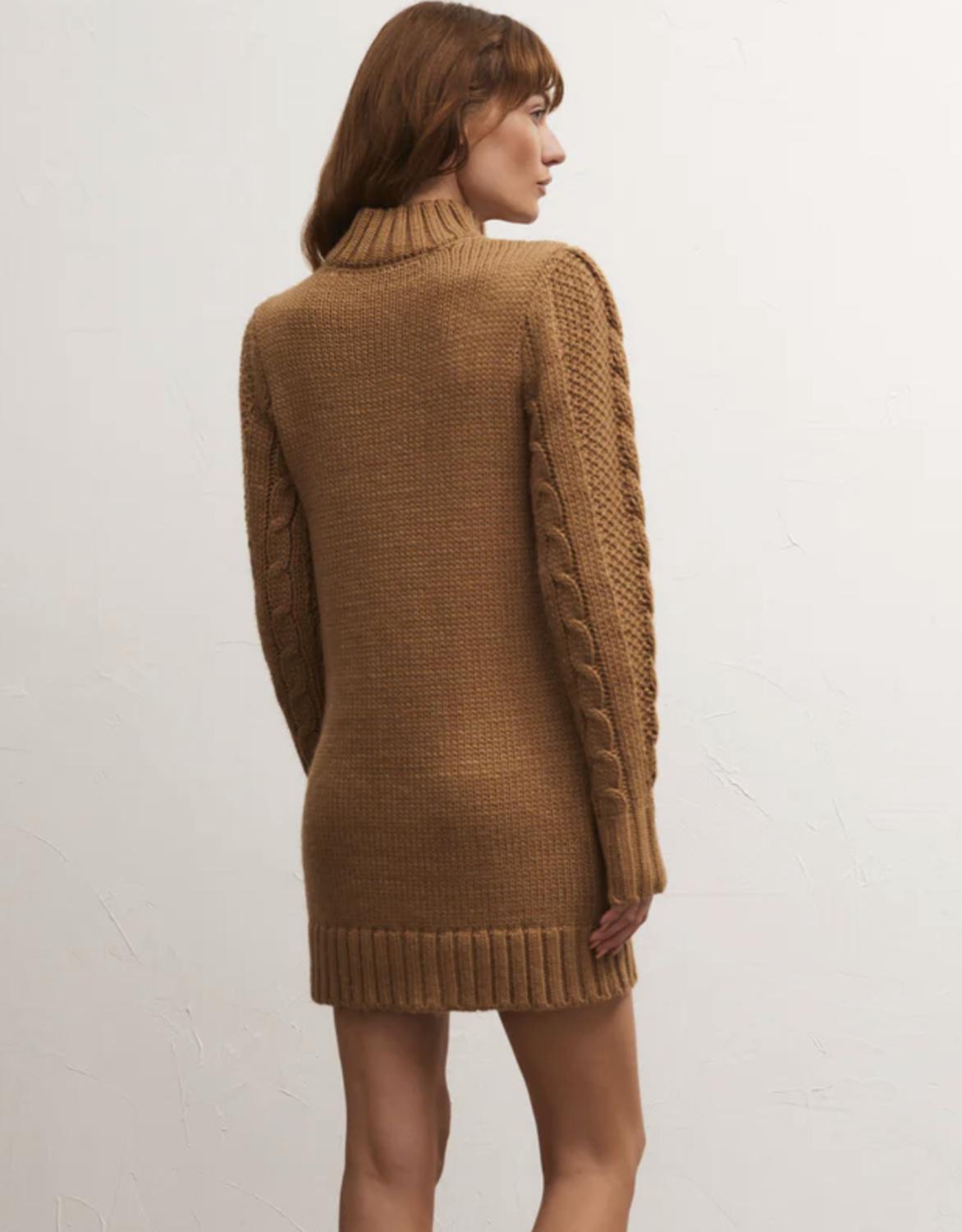 Fit to perfection and effortlessly chic. Made using chunky and plush acrylic yarns, the Sage Cable Knit Sweater Dress has a flirty, feminine feel you'll love showing off. Relaxed fit. Acrylic yarns: 100% Acrylic. Mock neck. Cable knit details. Chunky ribbed detailing. Pleats at shoulders. Hand wash cold, lay flat to dry.