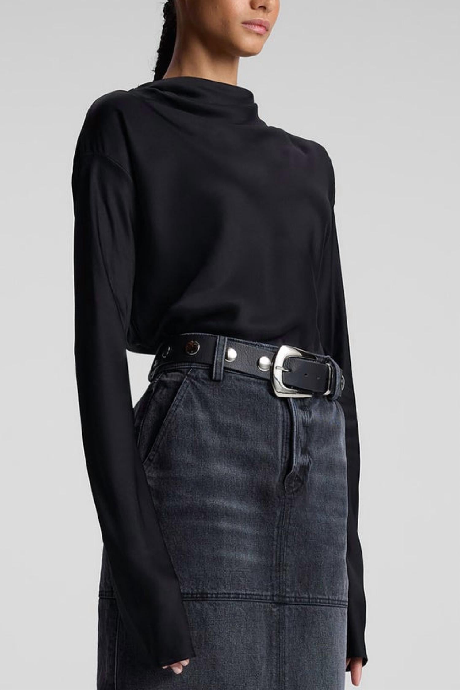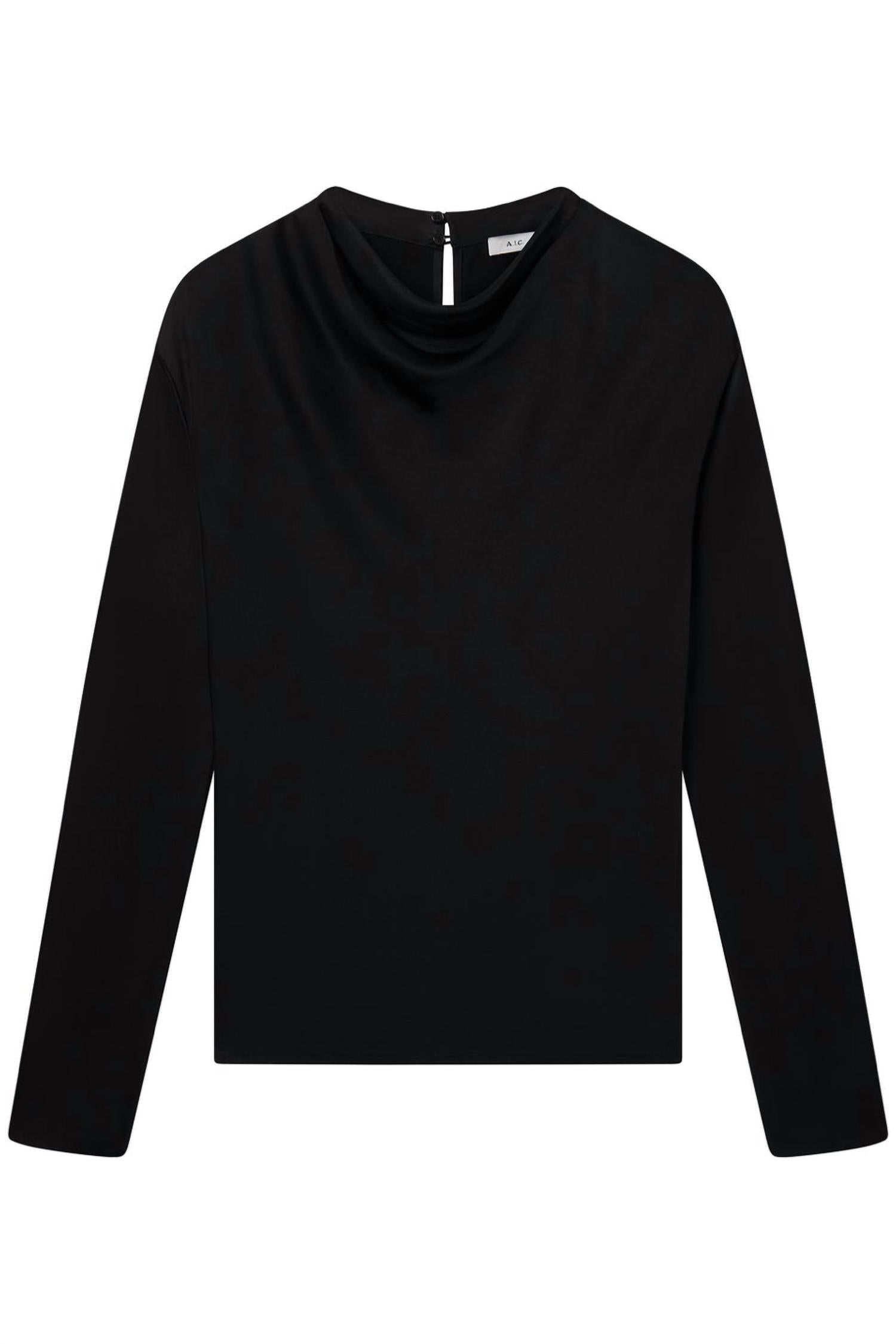 A long sleeve top you can wear with denim, skirts, well... just about anything! Introducing the Georgia Long Sleeve Top by A.L.C., a sophisticated choice for your evening event this spring. Crafted from 100% viscose in a timeless black, it features a chic high cowl neckline and a button closure for a refined look. This long sleeve garment showcases the quiet luxury trend with its solid pattern and sleek design. Imported and tailored for women, the top requires dry clean care to maintain its elegance.