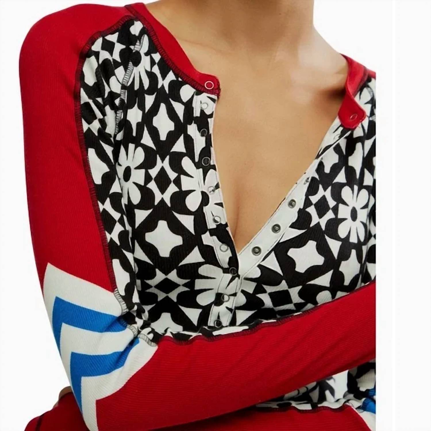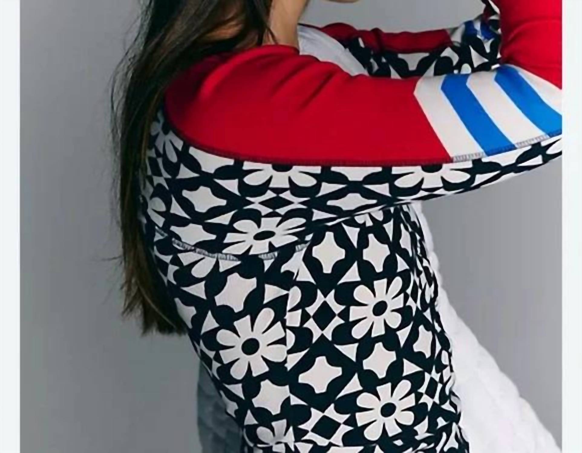 The perfect long sleeve tee that goes with just about anything. Free People Movement Women's Kick Off Printed Laye Aspen Onyx Combo (red, black, white, blue) cotton, elastane snaps half way down the front tight ribbing fabrication more of a tight fit.