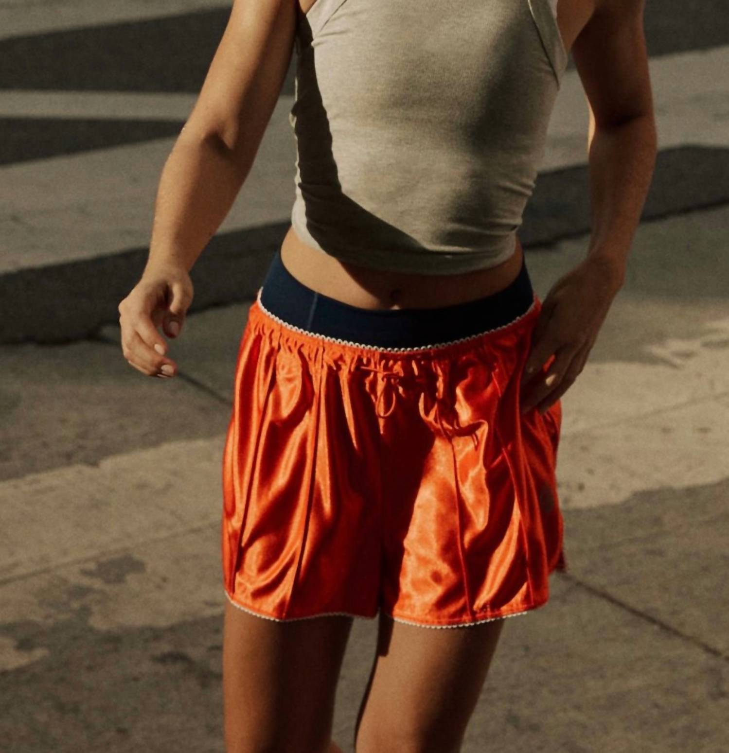 Athletic shorts that work for the gym or running errands! Introducing the Roll With It Short by Free People, perfect for those who love a blend of sweet and sporty style. Featuring a high-rise, longer flowy silhouette with lace trim and contrast stripes at the back, these shorts offer a relaxed and comfortable fit. Designed with convenient side slits and pockets, they feature a tie closure that enhances their practicality. Ideal for summer athleisure, these shorts in a striking Flame color are easy to care for with hand wash and line dry instructions.