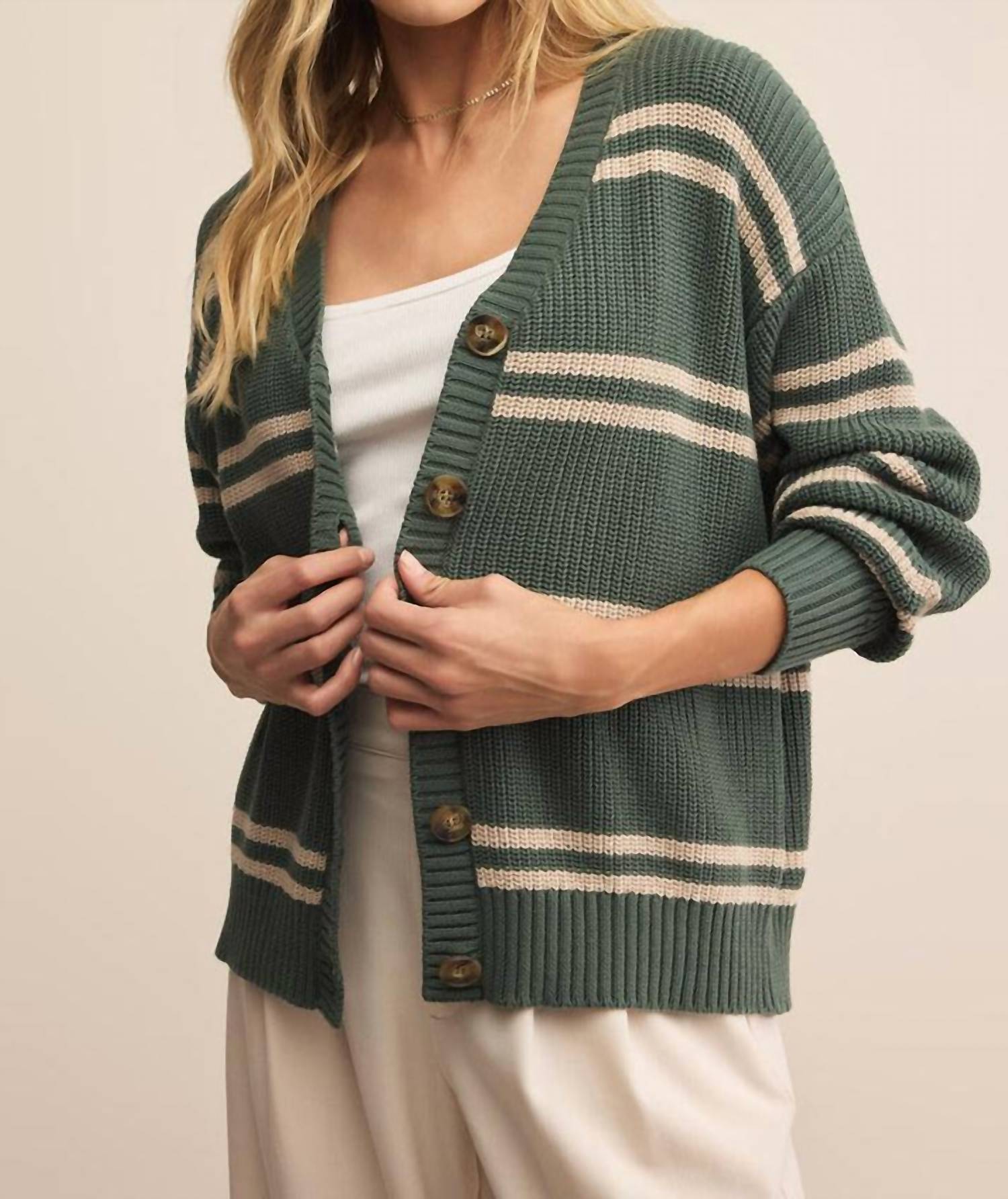 Throw this adorable cardigan over any cami or tank top. Introducing the Boyfriend Striped Cardigan by Z Supply, a varsity-inspired piece in a stylish hunter green with a flattering v-neckline. This cardigan features long sleeves and is expertly crafted from a lush Birdseye Jacquard fabric (50% Nylon, 28% Polyester, 22% Nylon), resulting in a midweight texture that's perfect for layering. Closure is a classic button closure, and it is designed with a relaxed fit. For care, hand wash cold, reshape, and lay flat to dry.