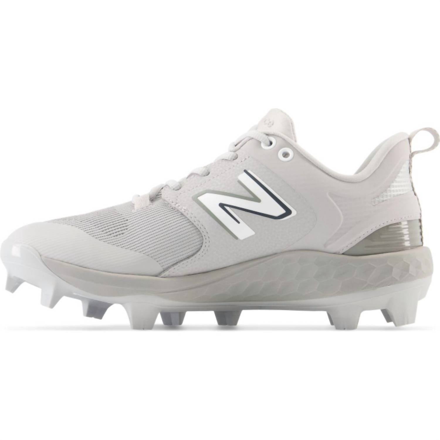 Experience unmatched comfort and performance with the New Balance Men's Fresh Foam 3000 V6 Molded Shoes in Grey. Featuring a breathable and durable easy-to-clean PU-coated mesh upper, these athletic shoes are designed with an ultra-comfortable Fresh Foam midsole cushioning for a lightweight feel. Benefit from the adjustable lace closure for a customized fit and a TPU molded cleat outsole for excellent traction on both turf and natural surfaces. An added TPU heel clip offers premium style, while the pull tab ensures easy entry.