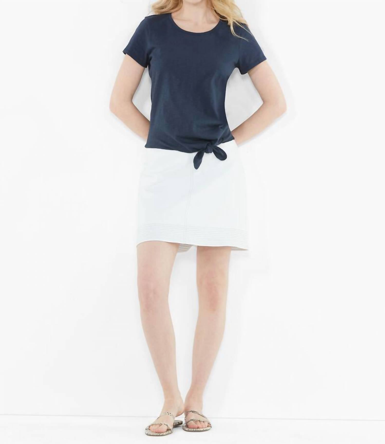 This classic, short sleeve tee will be your go-to staple this season and beyond. Enhance your casual wardrobe with the Short Sleeve Round Neck Tie Front Tee by Nic + Zoe, presented in a striking indigo shade. This chic knit pullover features a crewneck design with a stylish front tie detail, offering a regular fit that sits comfortably at the hip. The garment is crafted from 100% cotton, ensuring breathability and softness. Care for this piece by hand washing and laying flat to dry, preserving its pristine condition.