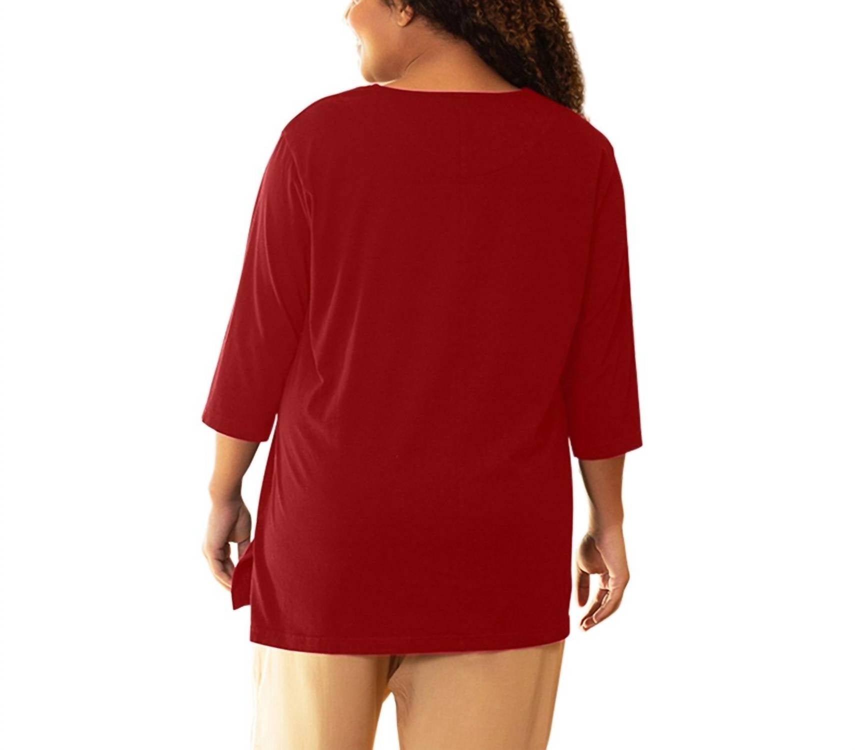 Loose waist. 3/4 sleeve. Machine Wash. Round neckline.
