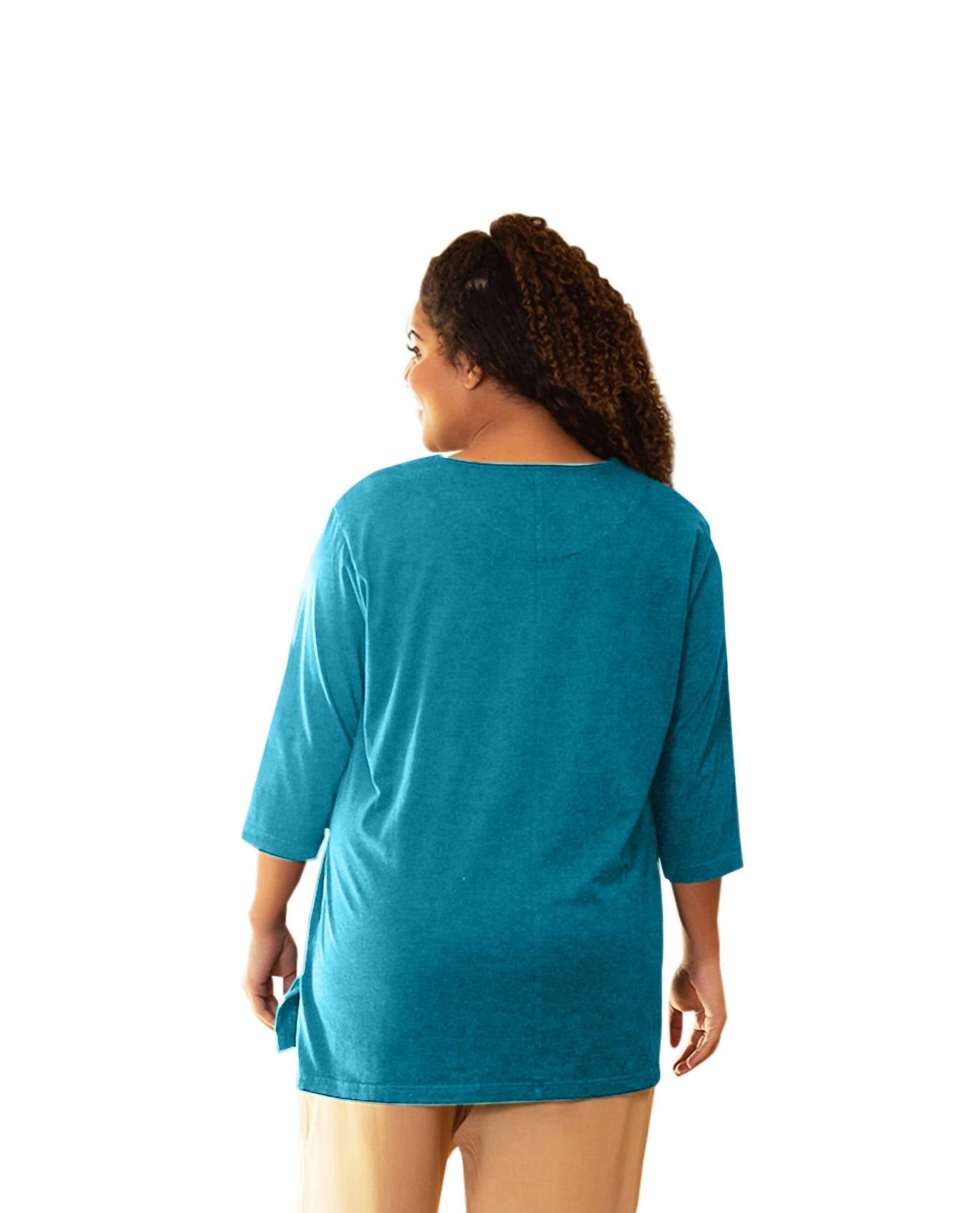 Loose waist. 3/4 sleeve. Machine Wash. Round neckline.