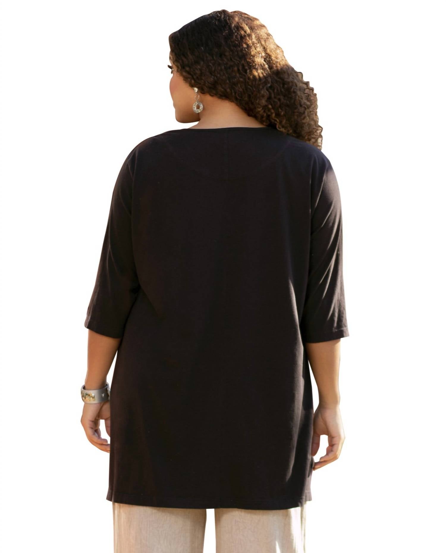 Discover the versatile charm of this tunic blouse, designed with both layering and standalone wear in mind. Its flattering silhouette and stylish details make it a closet essential. The On The Plus Side Black Jersey Henley Tunic is a perfect blend of comfort and style, designed with three-quarter sleeves and a notched Henley neckline. Made from a soft cotton blend, this tunic has a curved hemline and convenient side slits, finished with a three-snap closure at the neckline. It measures 37 inches in length for size 4X, with sleeve lengths of 17.5 inches. Care for this piece easily with machine wash.