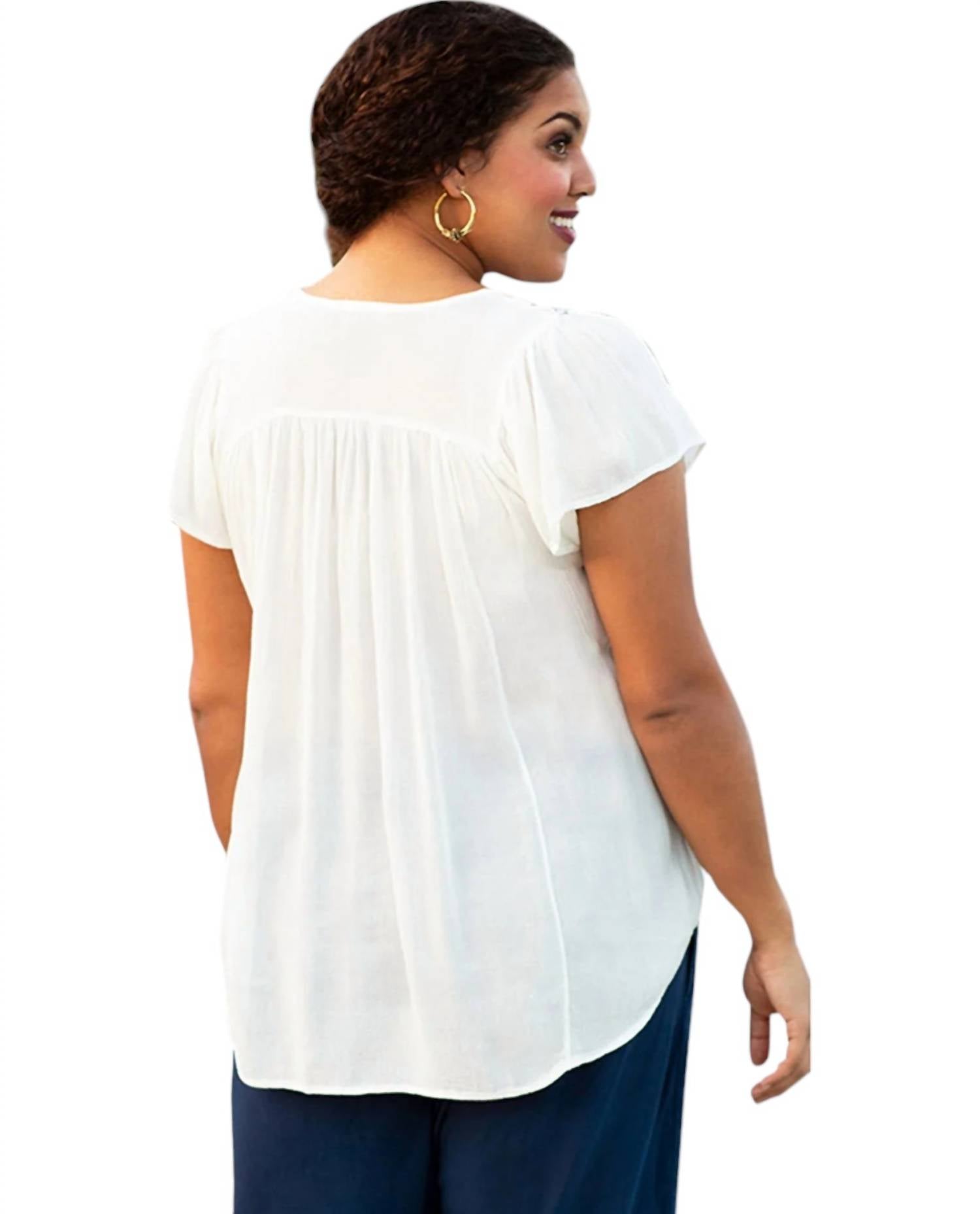 Thoughtfully designed for women who celebrate their curves. Cool crinkle cotton with a lightweight feel. Artistic embroidery around the flattering V-neckline. Touch of unique charm. Pull-on closure ensures effortless style. Short sleeves provide a breezy comfort. Offering both comfort and elegance.