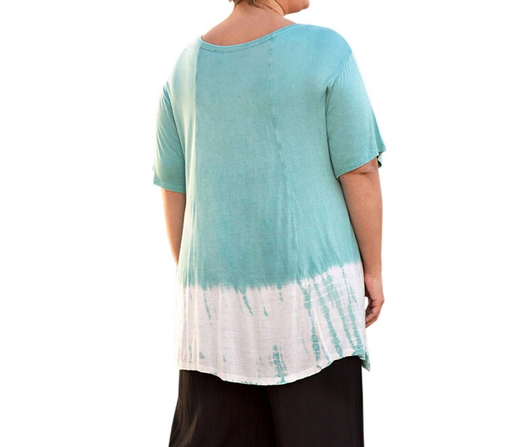 Tie-dye. Slight high-low hem. Relaxed fit. Multicolor. Short sleeve.