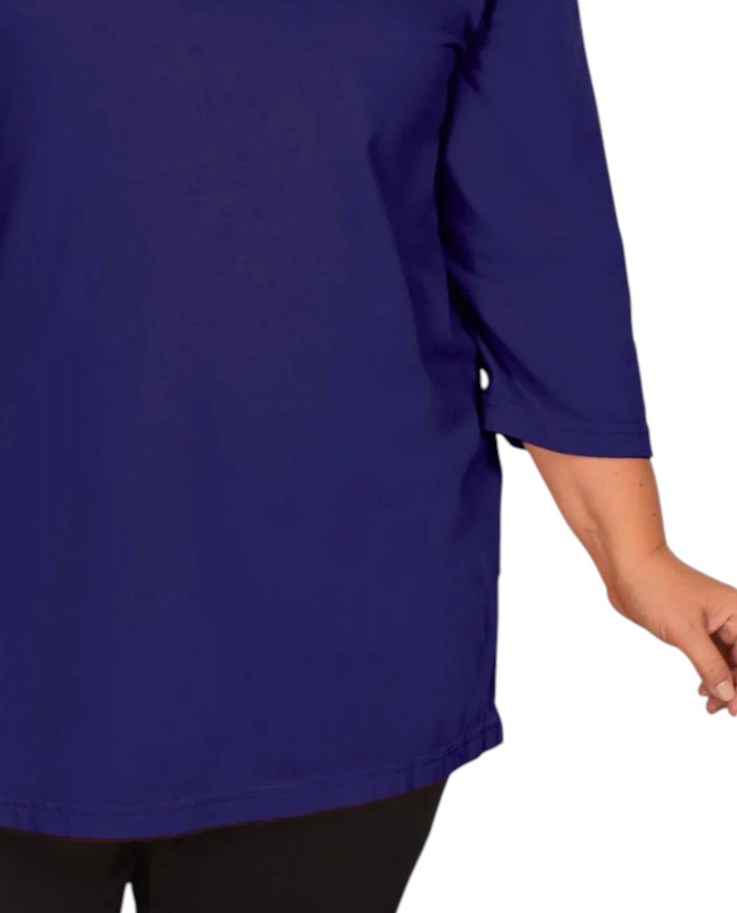 A versatile blouse that works from desk to dinner! The On The Plus Side Blueberry Plus Size Jersey 3/4 Sleeve V-Neck Tee offers a minimalist aesthetic perfect for any stylish dinner party or casual outing. Made from a stretchy Cotton Jersey Knit, with a composition of 95% Cotton and 5% Spandex, this solid-colored tee ensures comfort and breathability. It features a flattering V-neckline and straight hemline, complemented by convenient side slits and a pull-on closure for easy dressing. Care instructions recommend machine washing to maintain its quality.