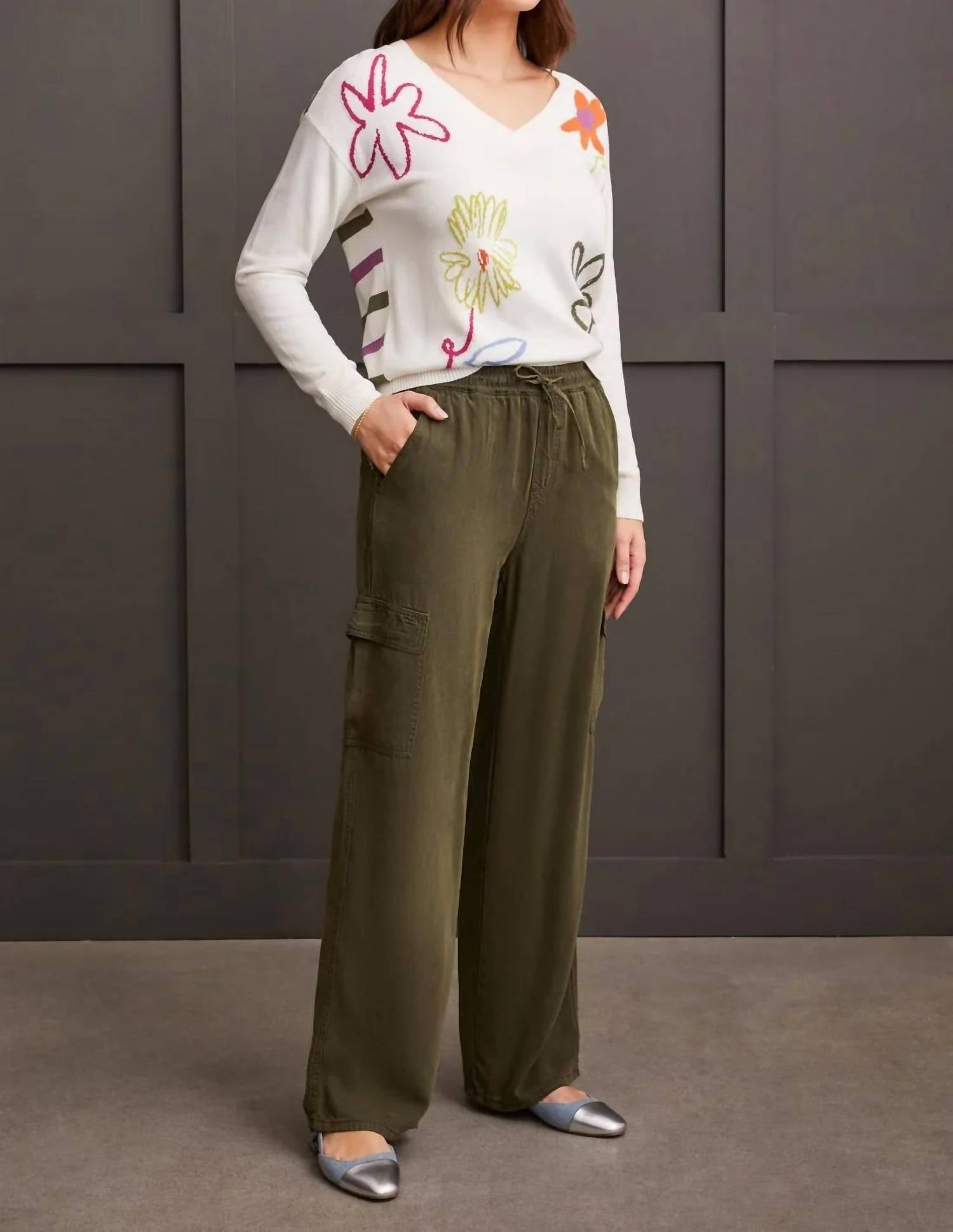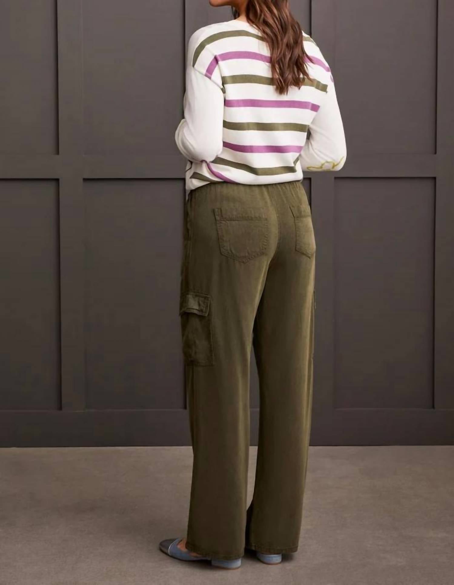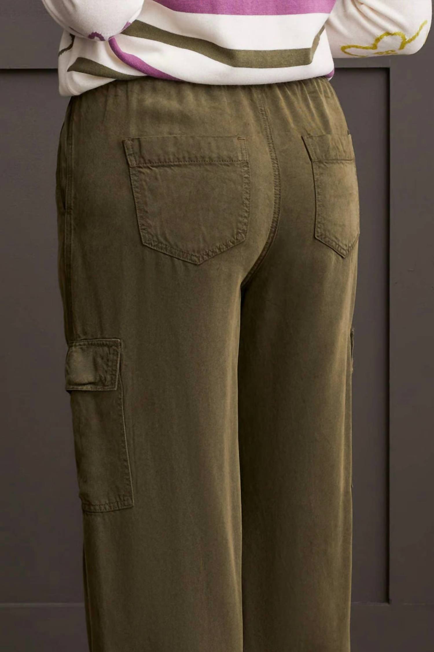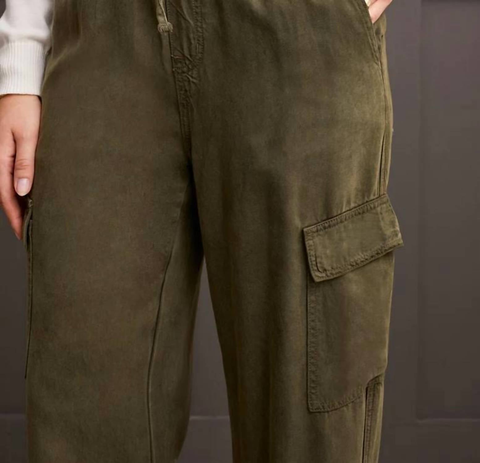 Crafted from flowy lyocell twill fabric, these jogger cargo pants offer both comfort and an elegant silhouette that drapes effortlessly. The wide-leg design includes an adjustable drawstring waist, roomy pockets, and a 31" inseam for optimal comfort and versatility. Available in two versatile colorways, they provide endless mixing and matching possibilities for your wardrobe. Pull-on drawstring waist Wide leg 31" inseam Functional pockets Garment washed flowy lyocell twill Machine wash normal cycle cold water, with like colors, do not bleach, line dry, do not iron.