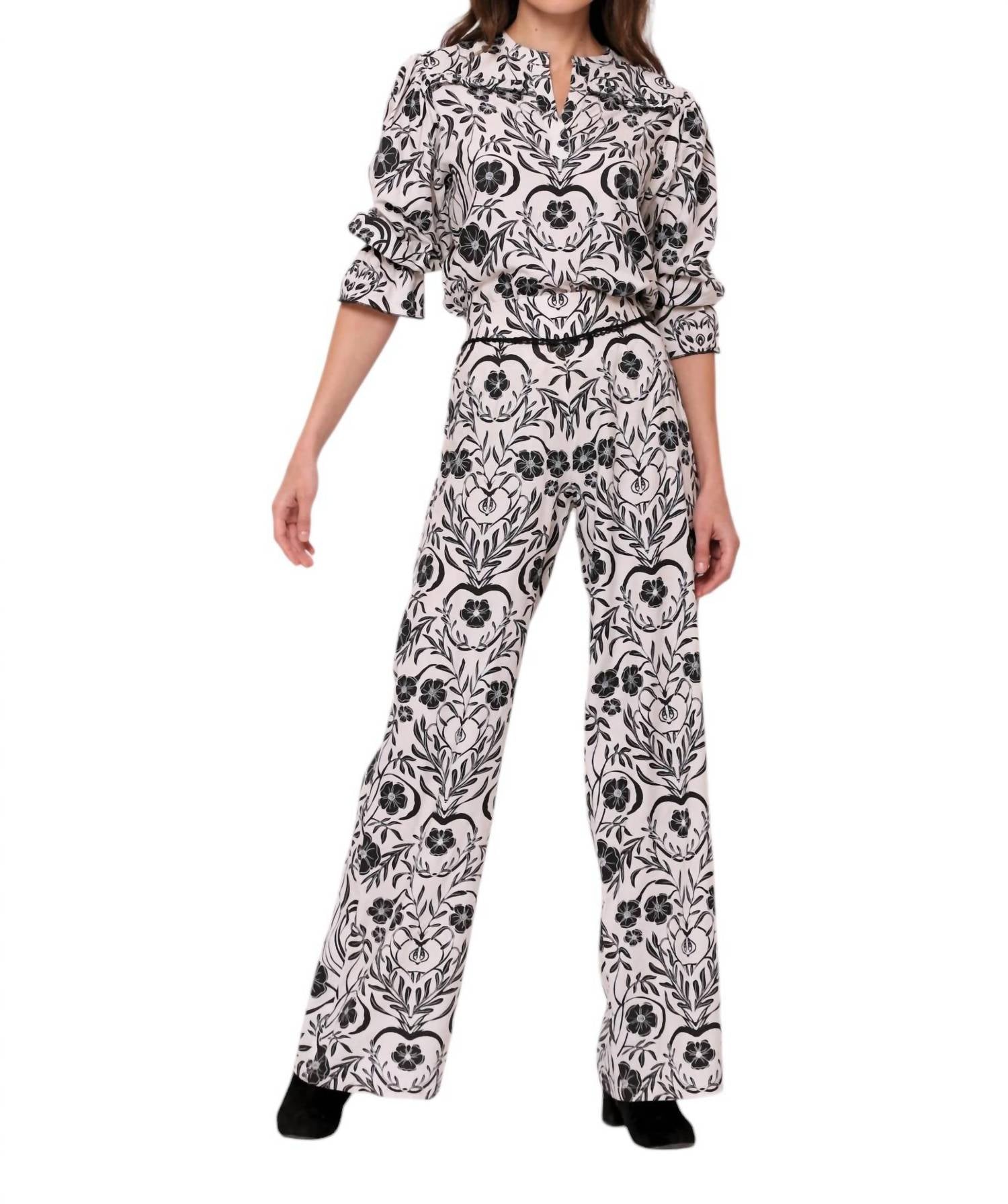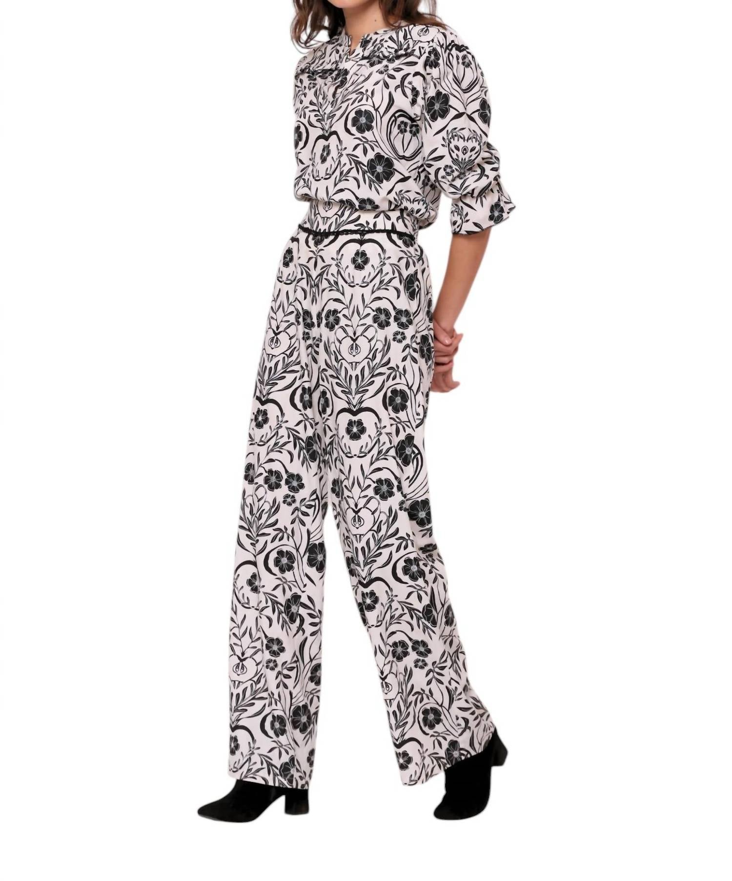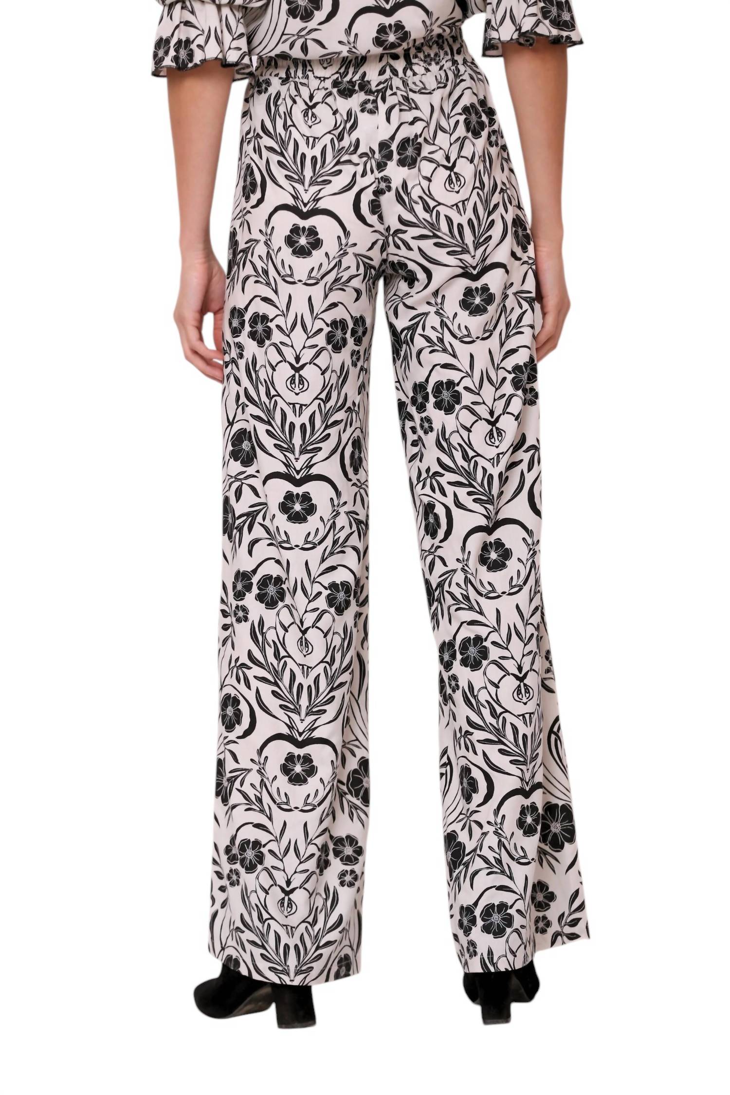 Embrace the essence of fall with the Teresa Pants by BEYOND by Vera, an irresistible wardrobe staple in an orchard black floral pattern. This relaxed-fit, wide-leg design boasts a flattering palazzo silhouette and is crafted from 100% Viscose. Enhanced with smocking at the back of the high-rise waist and a self-tie belt, these pants ensure the perfect fit. Closure: Pull-on. Care for them with a gentle machine wash or opt for dry cleaning; tumble dry if needed. Pockets: Yes.