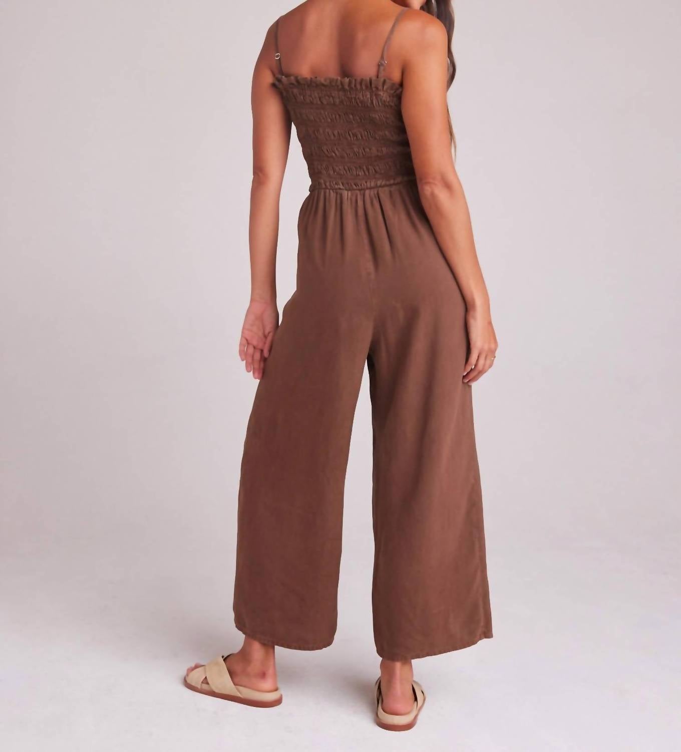 This stunning piece features adjustable straps and a smocked bodice for a flattering fit, with a wide leg design to elevate your look. Made in Los Angeles, it is crafted from 100% TENCEL‚Ñ¢ Lyocell for a luxurious feel. Easily pull on this jumpsuit and machine wash for convenient care, boasting a 52" length from shoulder to hem. Model is 5'10" and wears a size XS.