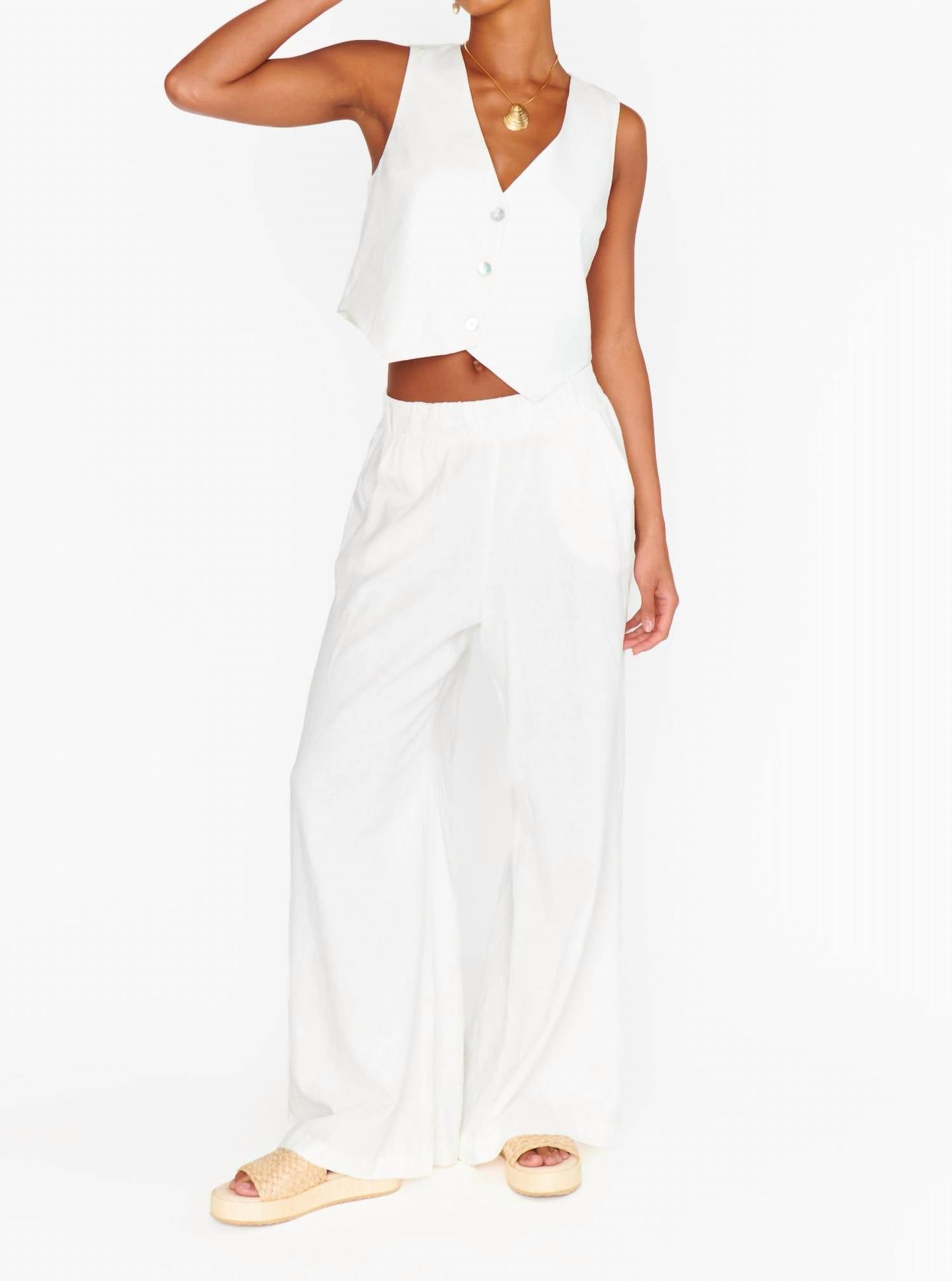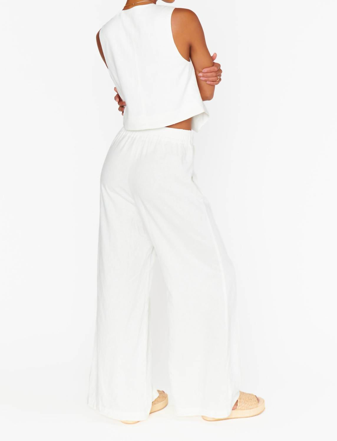 Elevate your summer wardrobe with the Vince Pants by Show Me Your Mumu, crafted in a chic white linen blend for ultimate breathability and style. Designed in a relaxed, wide-leg fit with a convenient pull-on closure, these pants are ideal for any casual outing. Composition: 55% Linen, 45% Rayon. Care: Machine wash cold separately, gentle cycle, do not bleach, tumble dry low, warm iron if needed. Pair seamlessly with the Show Me Your Mumu Vicky Vest Top for a coordinated look.