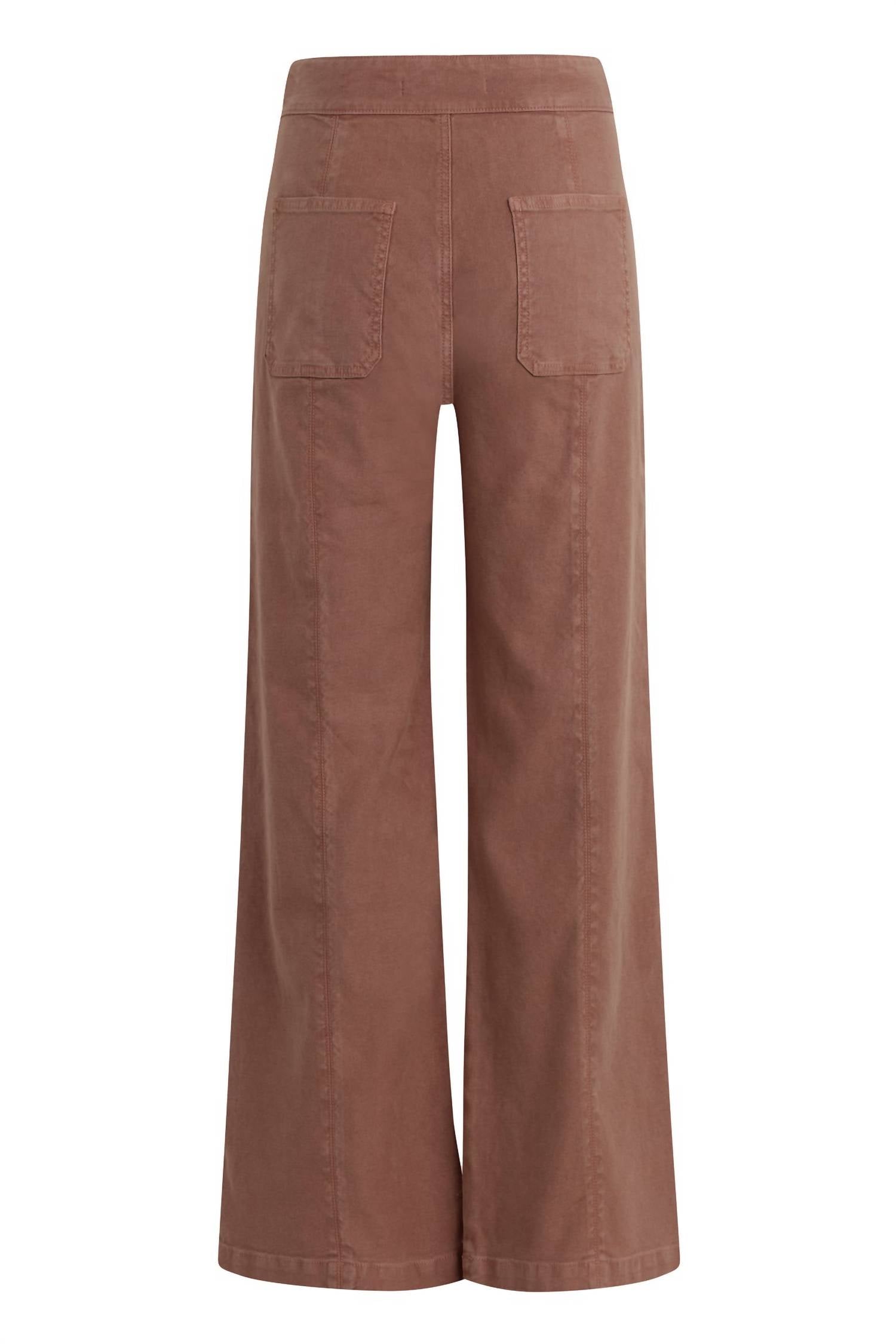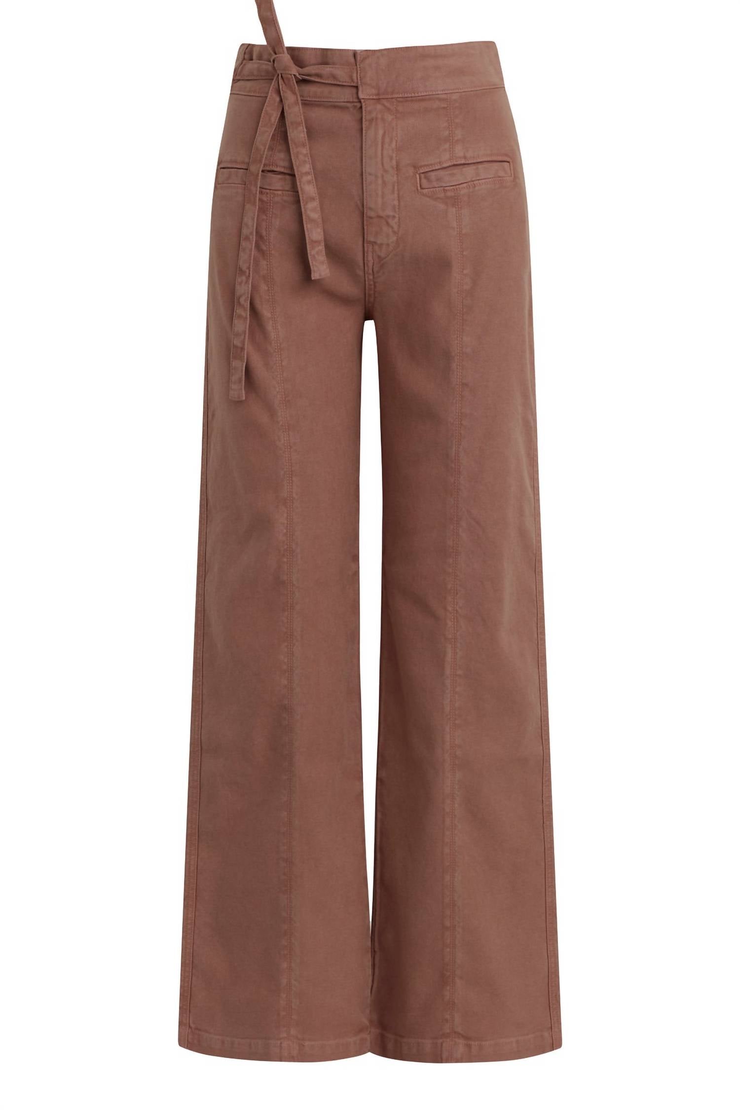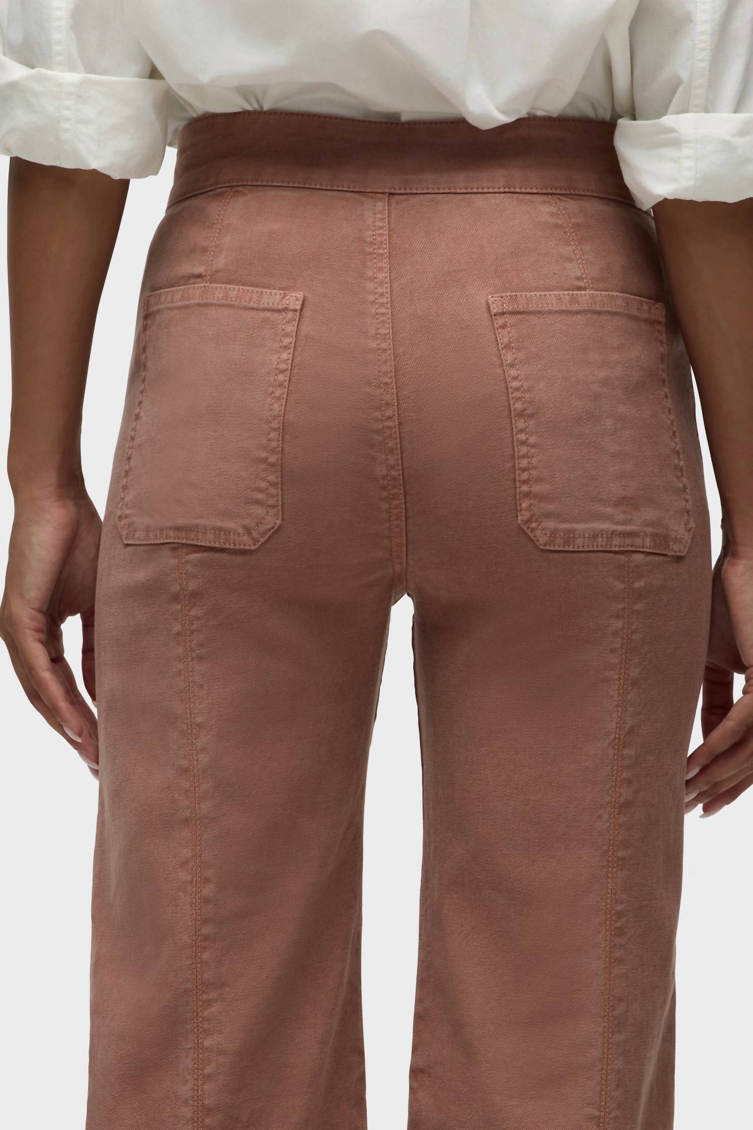These trouser pants feature an overdyed rust-orange wash, an elevated waistline, front and back pintuck details, and a side tie belt. Made from 44% lyocell, 29% linen, 25% cotton, and 2% elastane, the front rise is 10.25", the leg opening is 20", and the inseam is 28" (size 27). Machine wash cold and tumble dry low or hang to dry.